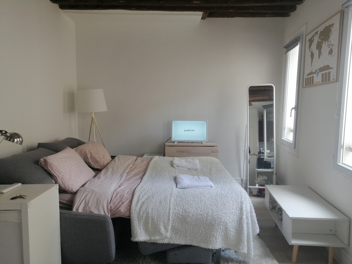 The Quincamp is an apartment of 30 m2 open space guy with a ceiling that is more than 3 meters above the ground. It is the 5er floor of a 18th century building with a 1 bed of 160 cm 2 can accommodate all guests in total. The apartment is fully equipped in terms of bed sheets, blankets, and pillows. The Quincamp Quincampoix is located in the 3 rd Street district. Its location places it in close proximity to all the attractions of central Paris. You will also find your feet all means possible transportation in Paris, RER, Metro, bus. The apartment is a 2 minute walk from the station the "halls", which will allow you direct access by public transportation from all airports in the capital. It has close to all the shops you need to do your shopping or an infinite number of restaurants and coffee. In terms of equipment the Quincamp has a TV with cable channels. Wireless internet is also available. The kitchen is an open kitchen. It is equipped with a refrigerator, a freezer, two hobs, microwave, coffee maker, kettle, toaster and all necessary kitchen utensils oven. Integrate the kitchen you also have a washing machine with a drying function. The bathroom has a sink, shower, wc, a bathroom furniture, bath towels, hair dryer and heated towel rail.