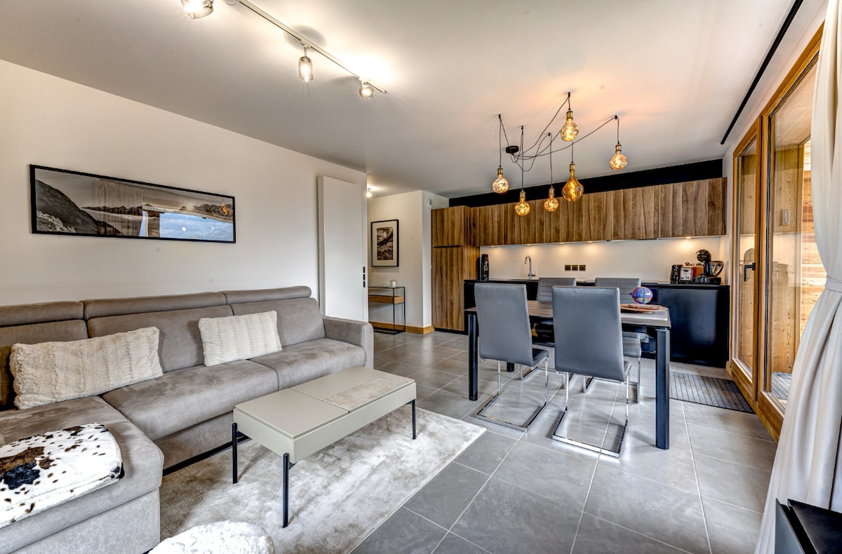 Modern 68 m² ground-floor apartment in a detached chalet, sleeping up to 6 in a quiet location. It has a fully equipped kitchen, open-plan living/dining area, smart TV, fibre-optic internet, and two bathrooms (one en-suite). The spacious east-facing entrance offers stunning views of the Mont Blanc Massif, including the Aiguille du Midi and Les Drus. Outside, a small private deck with table and chairs opens to an unfenced garden.