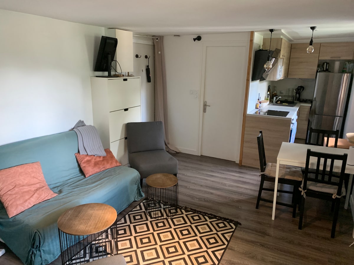 En lisière de la forêt, appartement de 30 m2, indépendant, calme, sans vis à vis, et neuf de 2 pièces. Appartement tout équipé composé d'une pièce à vivre avec cuisine ouverte (four, micro-ondes, lave-vaisselle, réfrigérateur, congélateur, machine Nespresso), coin repas, salon, d'une salle de bain (douche et WC) ainsi qu'une chambre avec lit king size de 160 x 190. Place de parking privative. Appartement neuf. Très belle vue sur la chaîne du Mont-Blanc et l'Aiguille du Midi. Idéal pour un couple