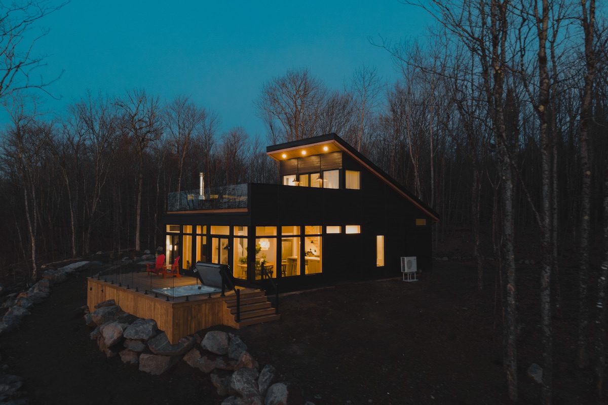 ★ One of the most unique chalets in Mont-Tremblant★ Unique & Secluded all White Glass Treehouse with Breathtaking Mont-Tremblant mountains views! The cabin is majestically glazed architectural space combining natural simplicity and contemporary luxury, 10 min from village of Mont-Tremblant, Ski Tremblant. Nestled on the end of the cliff with a fully glazed living space, Bathtub with view, The Panoramic terrace & Private hot tub for an unparalleled relaxation experience. Canadian Designer.