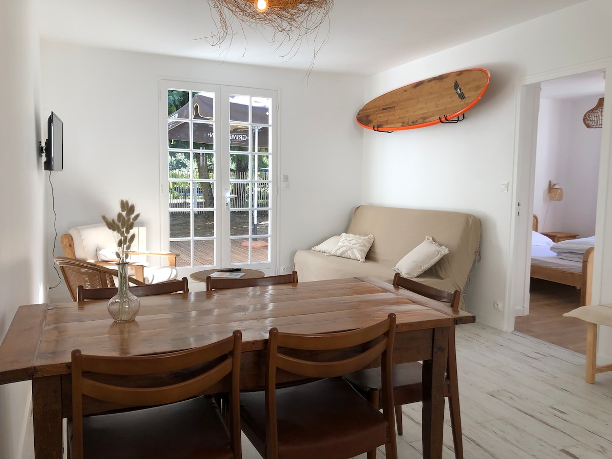 Maison entièrement rénovée en plein de coeur de Grand Village. Situation parfaite pour passer des vacances à la mer. Vous n’aurez qu’à traverser la forêt pour vous rendre à la plage en 15 min à pied ou 5 min à vélo. Les commerces sont situés à 1 min à pied. Vous trouverez tout ce dont vous avez besoin dans le village : boulangerie, supermarché, bar, tabac, restos. Parc pour enfants, terrains de pétanque, location de vélo et de surf à proximité !