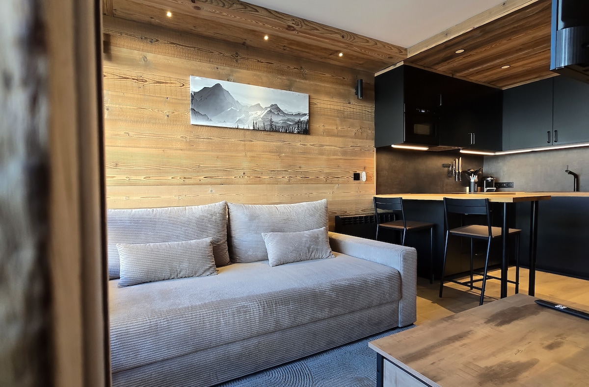 Fully refurbished (2022) studio in a "mountain typical and cosy style" (19 square meters), shoe cupboard and ski locker, in Les Menuires ski resort in the famous 3 Valleys domain (French Alps). Includes a high-quality bedding queen-size (160x200) convertible sofa, for your comfort. Perfect for winter (ski in / ski out) or summer holidays. Dedicated free Internet Wifi included. Looking for a bigger apartment? Come back to us.
