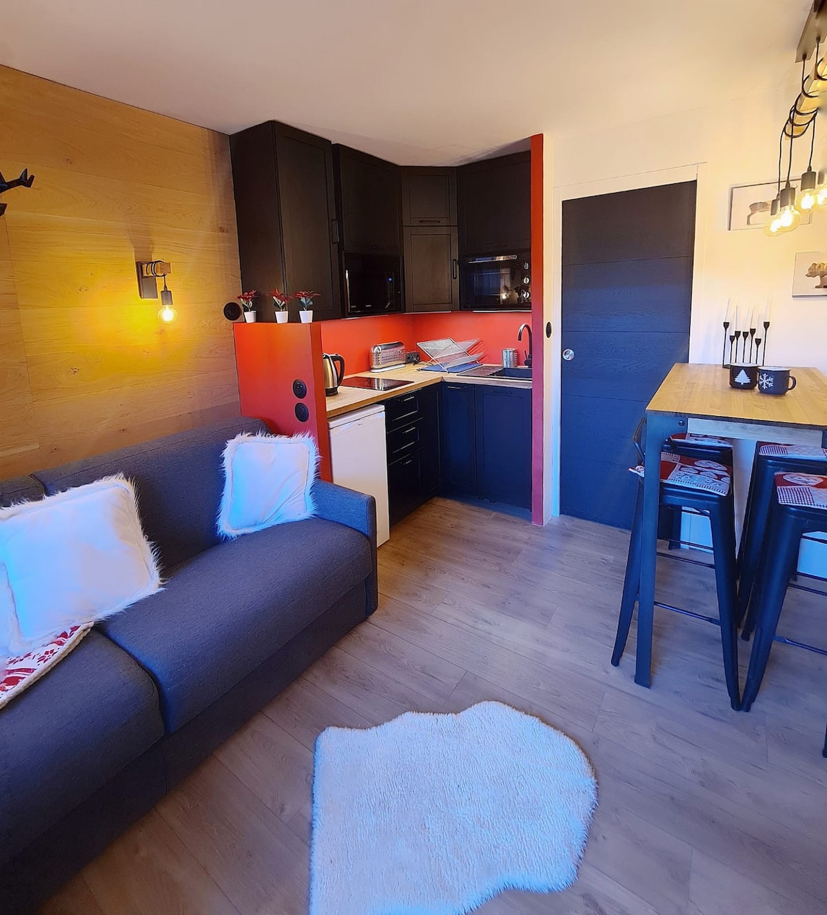 Studio cabine refait à neuf de 17m2, idéal 2 personnes, mais peut accueillir 4 personnes Il dispose de 4 couchages, un canapé lit double dans le salon, et 2 lits escamotables dans l'entrée A 2min à pieds des remontées mécaniques(150m) et proche de tous commerces, un arrêt des navettes gratuite est juste en bas de la résidence L'appartement dispose d'un lave vaisselle, cafetière, grille pain et bouilloire, ainsi que d'un casier à ski Les draps, serviettes et le ménage sont compris Wifi gratuit