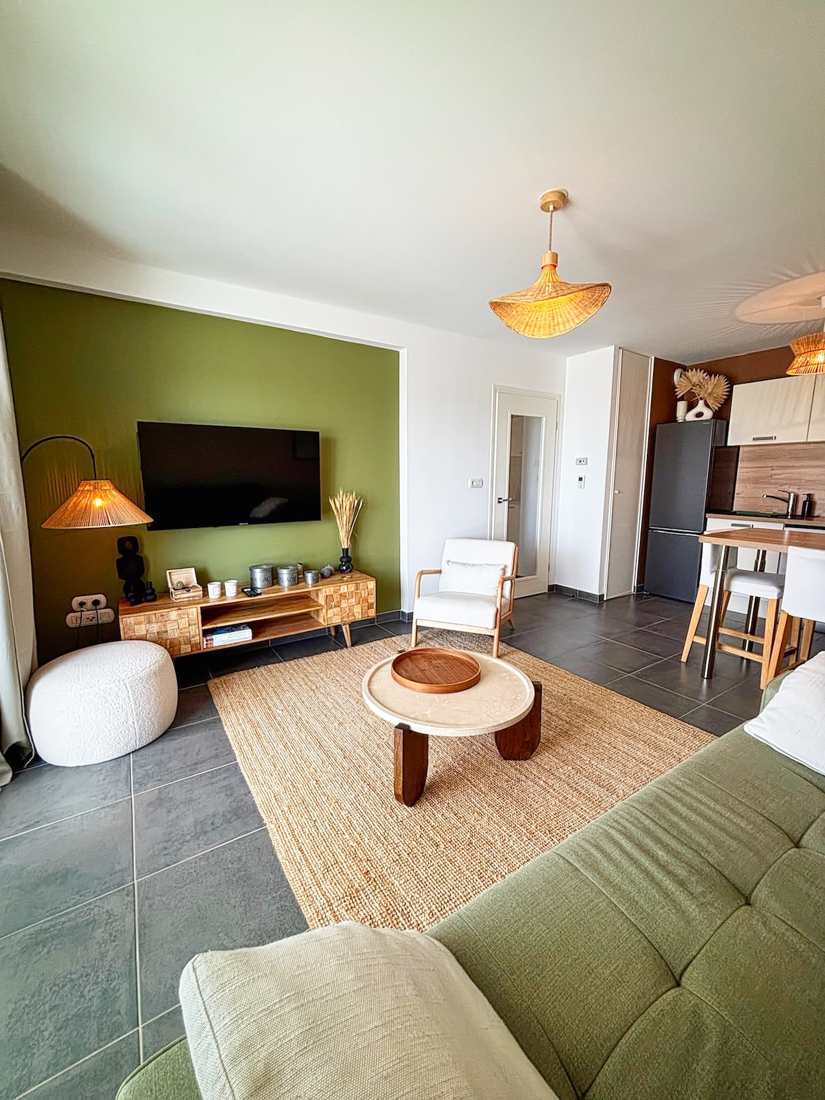 Appartement avec vue mer et plage, comprenant séjour (canapé lit), une chambre avec lit double (modifiable en deux lits simples) et une petite chambre avec deux lits simples superposés. Jusqu'à quatre personnes seront comfortablement installées et jusqu'à 6 personnes pour un court séjour. Accès petit balcon depuis le séjour et la petite chambre. Entrée avec accès coin cuisine, salle de bain (baignoire), WC séparés. A proximité : supérette (ouverte 7/7), boulangerie, restaurants, aire de jeux.