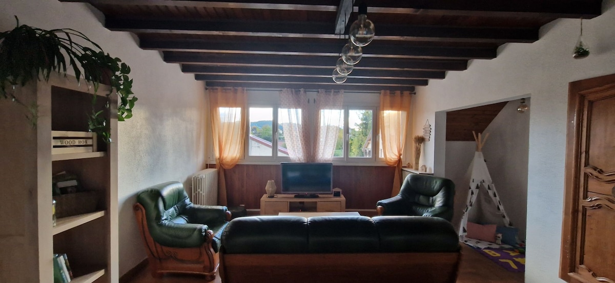 L’automne arrive à grand pas ! Venez profitez des belles couleurs du Jura. La maison de Gazi est un gîte de 150m2 dans un village près de la forêt de joux. Besoin de se détendre sur la terrasse vu sur le massif du Jura, après une journée de VTT ou de randonnée. Une soirée plus fraiche, le canapé près du poêle est là pour vous accueillir pendant que les enfants peuvent jouer dans la mezzanine. Tout est prévu pour vous concocter de bons petits plats.