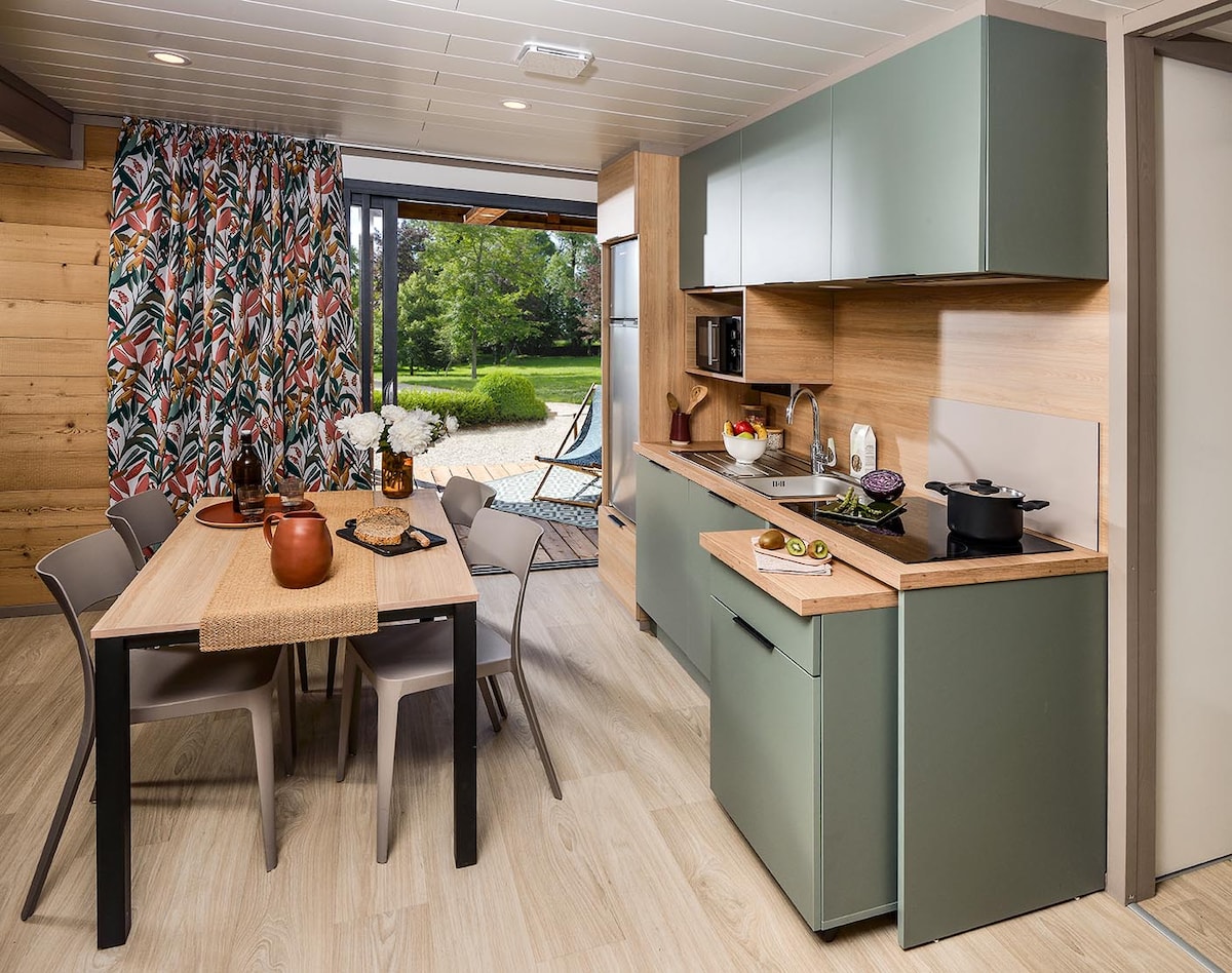 Ce lodge de 32m2, lumineux et spacieux, a été pensé et aménagé pour vous procurer une détente absolue. Avec son lit queen-size suspendu, son poêle à granulés, et son jacuzzi extérieur privatif couvert en cas de pluie, venez vivre une expérience relaxante au milieu de la nature. Grâce à la guirlande led sous le lit, choisissez l'ambiance que vous souhaitez. Dans un cadre intimiste, à l'abris des regards des deux autres lodges, profitez également de nos prestations gourmandes, et de bien-être.