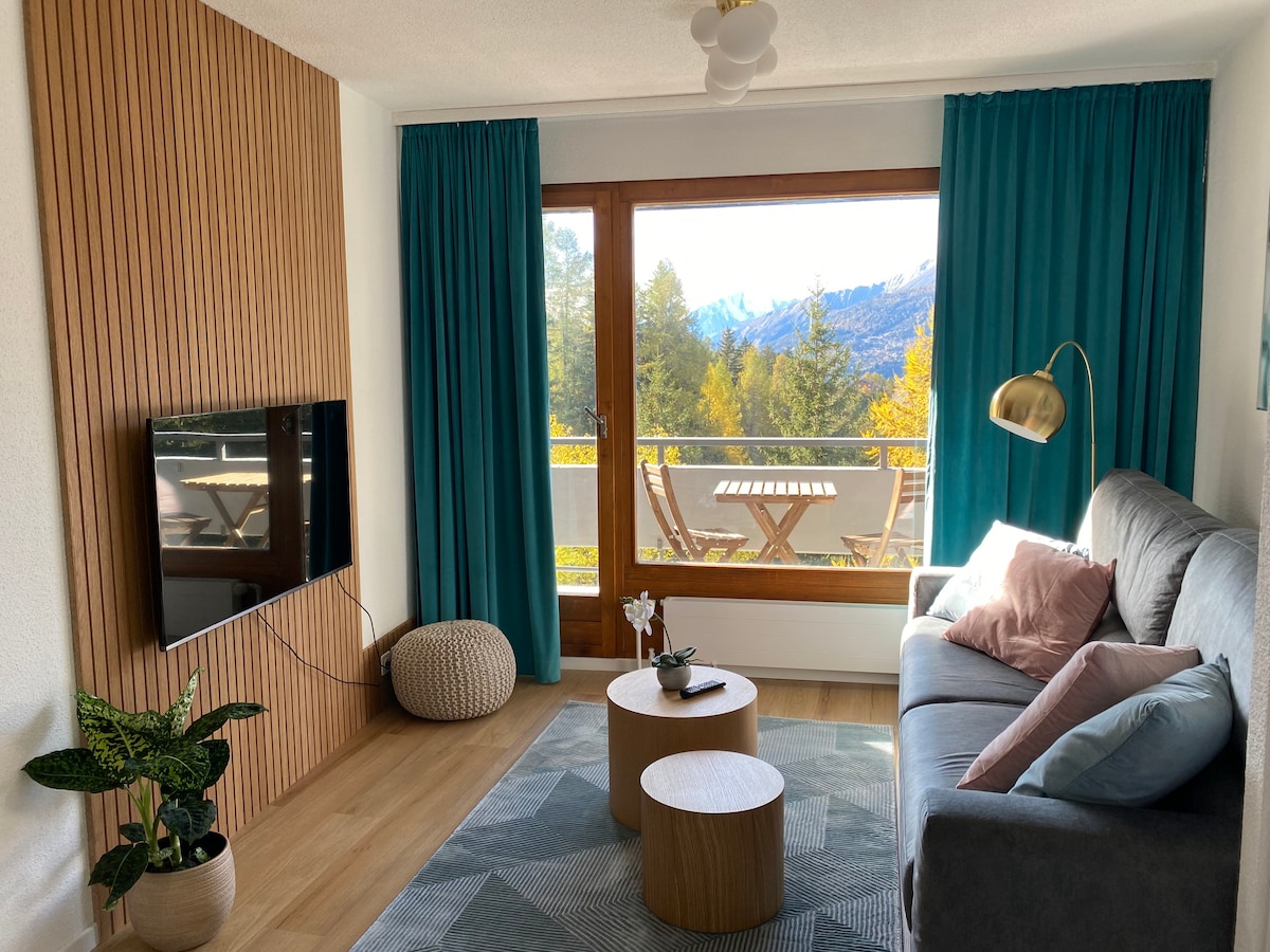 Friendly, modern and cozy studio. Ideal location, quiet, a few minutes walk from the city center. Nice view of the mountains, sunny balcony from afternoon til sunset. In the winter season you will appreciate the proximity of the Snow Island for the kids or the free shuttle to take you to the ski slopes. Back from the heights, let's get cozy and enjoy the fireplace ! In the summertime you will appreciate the proximity of the 2 golf courses. Enjoy the pool and the tennis court of the residence !