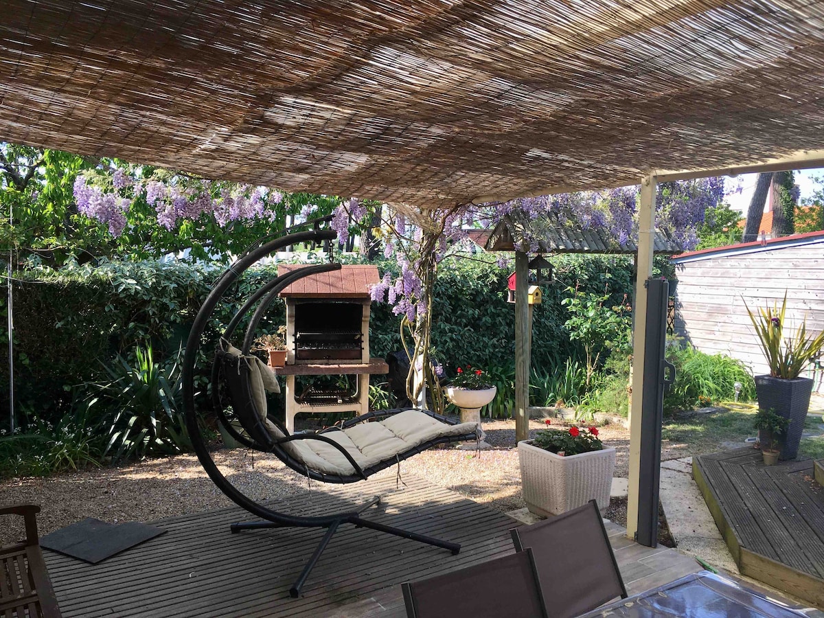 Avec une position unique à 100m de l’océan et de la plage familiale de Boisvinet, vous pourrez profiter du calme des ruelles de ce quartier dans cette maison typique (classée bâtiment remarquable) des années 1930. Au RDC la maison vous propose, une grande pièce à vivre donnant sur la terrasse et le jardin. Les draps, serviettes et le ménage sont inclus. Les plus: équipements bébé disponibles sur demande, jeux pour enfants, accessoires pêche, vélos, barbecue & plancha Jardin clos sans vis à vis