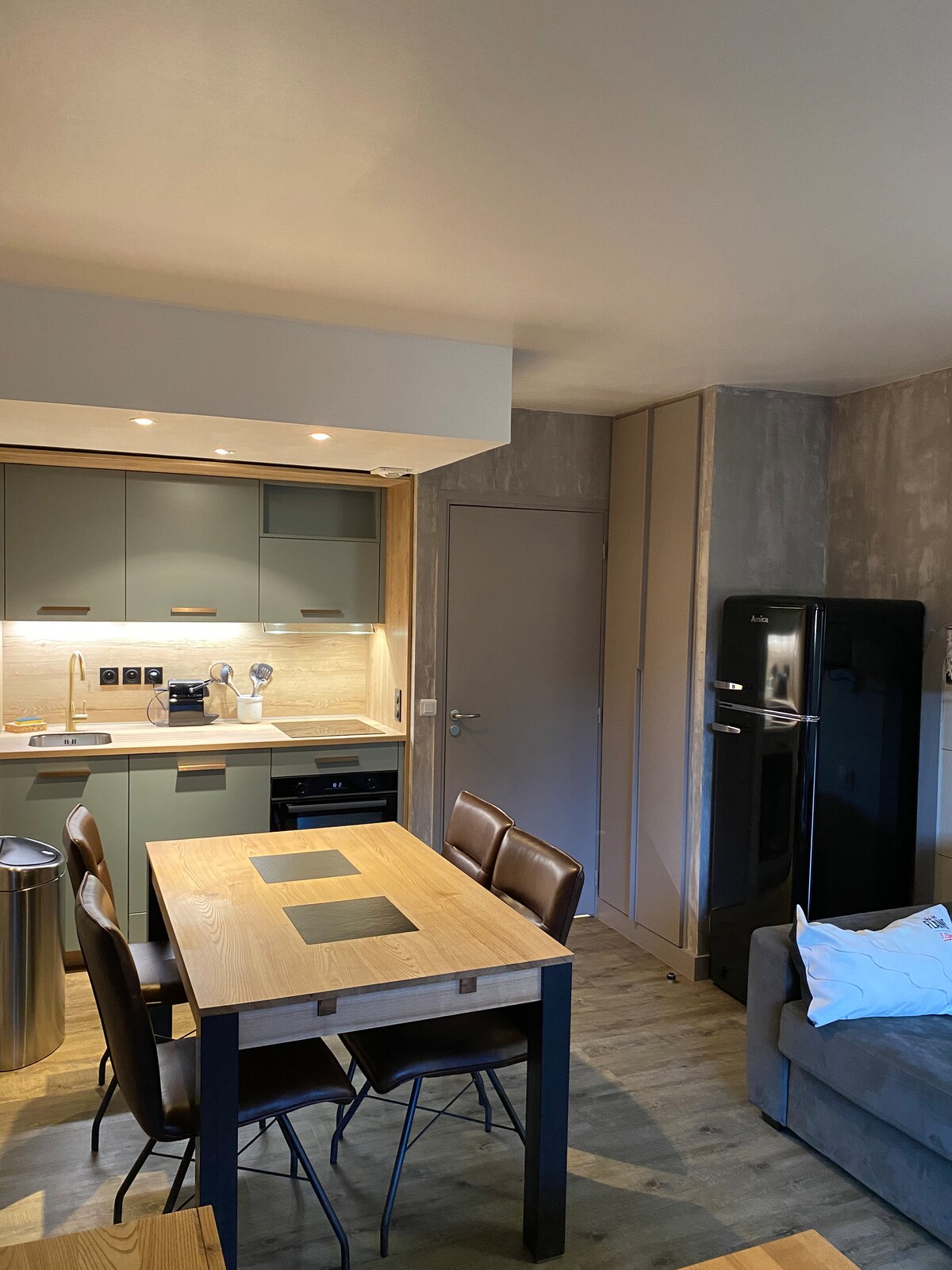 Welcome to our family apartment at Mirantin. This premium-renovated space accommodates up to 5 guests, offering a cozy interior and stunning views of Mont Bisanne and Pierra Menta. You'll be welcomed upon arrival, with optional services like restaurant recommendations or ski lesson bookings. The rental includes a private garage, and the Chenavelle slope is just at the end of the street. Note: the apartment is on level R-2 and is not wheelchair accessible.