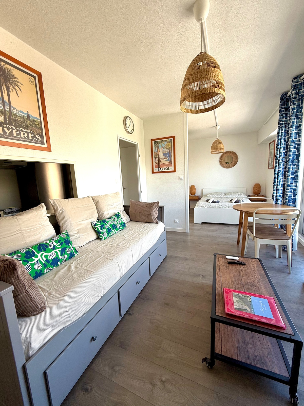 Bienvenue à Beau Rivage ! Imaginez commencer votre journée avec un café en terrasse, suivi d’une balade en kayak sur une mer d’un bleu cristallin… puis d’une partie de pétanque sous les pins avant d’admirer le coucher de soleil sur la plage du parc de Beau Rivage.Ici, chaque instant est une invitation à la détente et au bien-être. À 100m de la plage, installez-vous dans ce studio moderne et cosy, avec terrasse privative. Garez votre voiture, ne l’utilisez plus, tout se fait à pied.