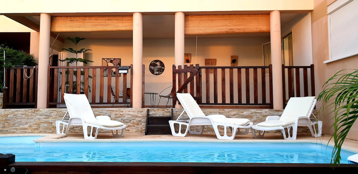 Logement proche de la plage accessible à pieds, equipé d'un jacuzzi privatif avec vue mer et montagne depuis le jacuzzi. Il est au premier étage. Profitez d'une situation exceptionnelle proche du lagon. Fêtes interdites. Le jacuzzi est accessible à toute heure, cependant les buses de massages sont programmées jusqu’à 21h et reprennent à 8h. TARIF DÉGRESSIF SELON DURÉE