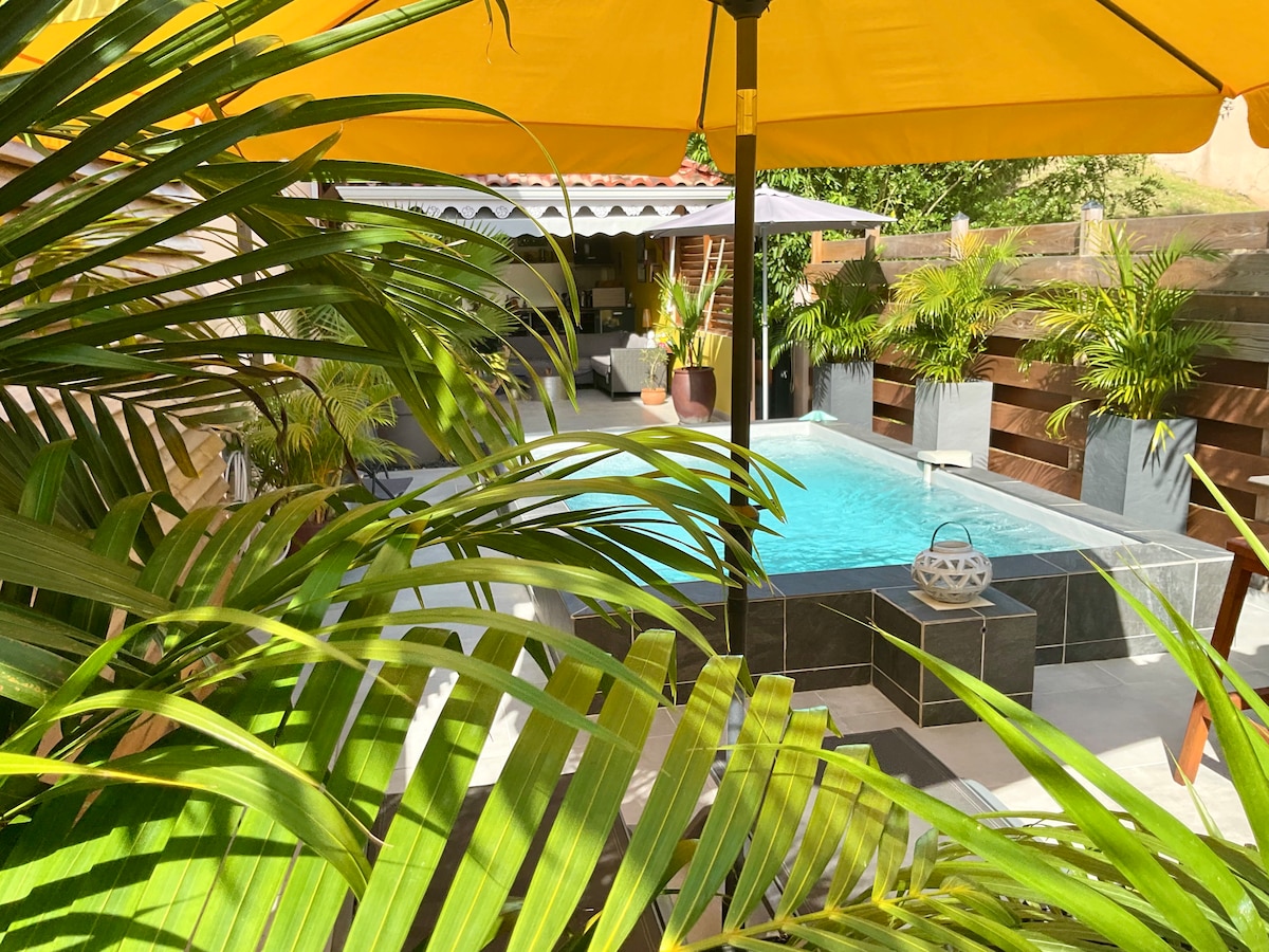 Quiet, romantic 2-room apartment 105 m2, intimate with its private "pool house" space, just for you whith: spa, swimming pool, barbecue, plancha, Ping Pong and relaxation area. All in a green setting with a panoramic view of the Caribbean Sea, Mount Pelée and the bay of Fort de France. Restaurants and shops are 2 minutes by car from Bourg des Trois-Ilets and the most beautiful beaches are 10 minutes away.: The best geographical location for visiting the island. Closed parking. Fiber internet