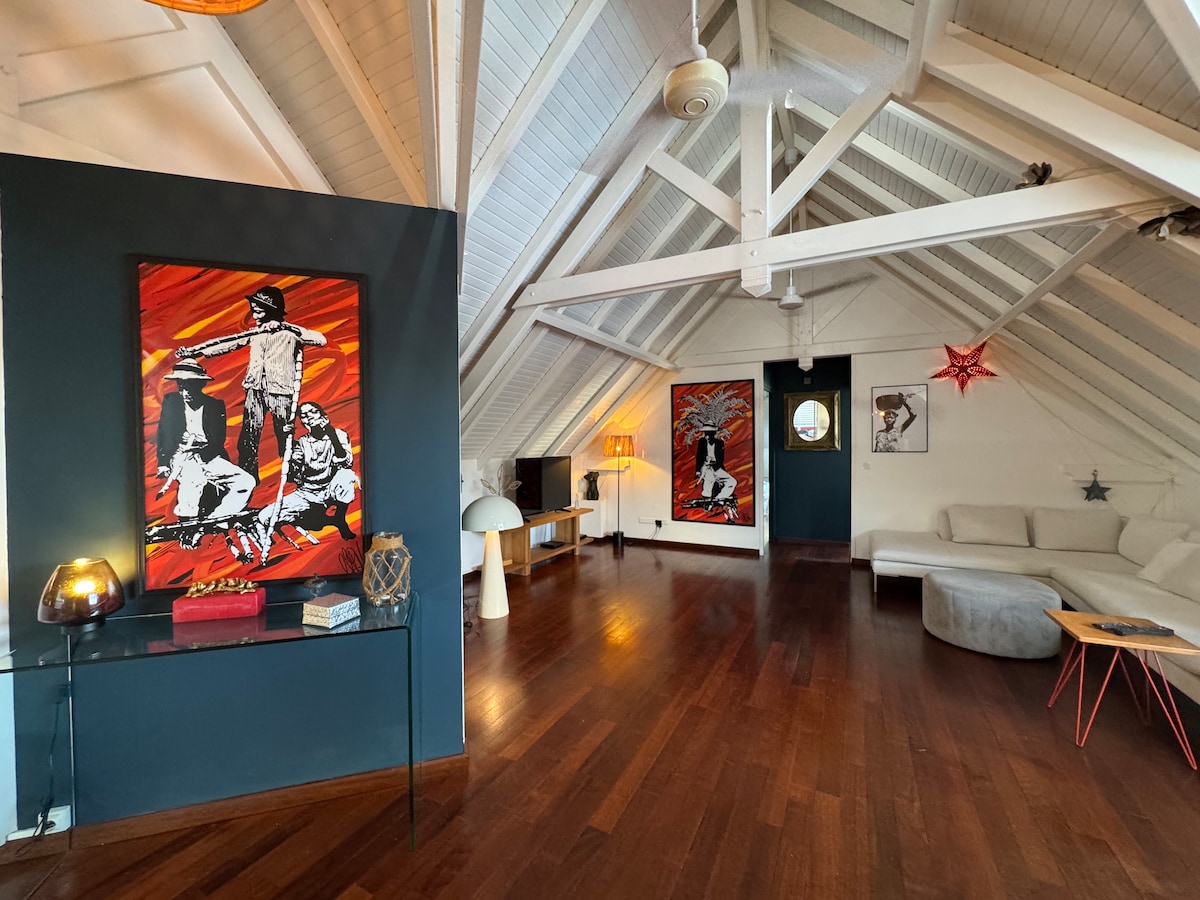 Au cœur des Trois-Ilets (à l'Anse à l'Ane), ce spacieux appartement de plus de 100m2 haut de gamme vous offre tout le confort nécessaire pour un séjour inoubliable en Martinique. - vue mer imprenable - Emplacement privilégié (commerces, restaurants, mer et services accessibles à pied) - Au calme dans une petite résidence au dernier étage sans vis a vis, plage à 400 m Entièrement équipé, climatisé, décoré avec goût, l'appartement allie modernité et authenticité caribéenne par son architecture