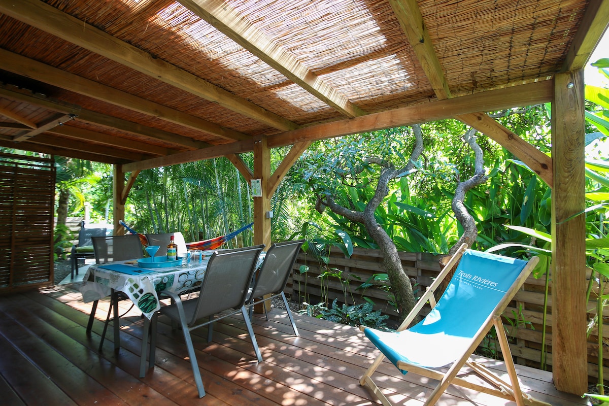 L'Hibiscus: maisonnette vue mer dans le village authentique de Petite Anse d'Arlet. Dans un jardin tropical, elle fait partie d'un groupe de 7 bungalows. La mer est à 200m et la plage s'étend sous les cocotiers. Possibilité d'acheter du poisson frais au port ou au ponton des pêcheurs que vous pourrez faire cuire au BBQ devant le bungalow. Ici tranquillité et calme garanti !