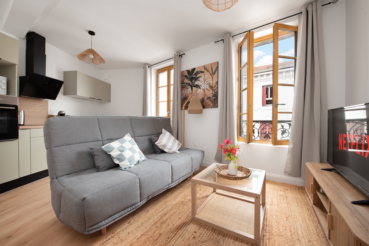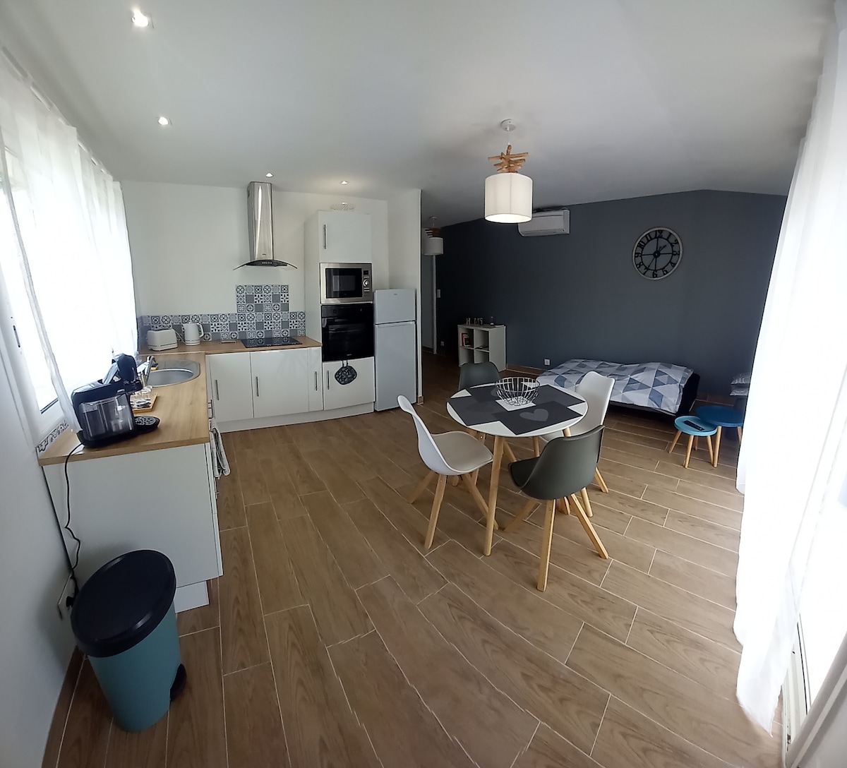 C' est un logement de 38 m² avec climatisation réversible. Il est constitué d' une cuisine équipée (lave vaisselle, micro-ondes, frigo, plaque feu cuisson, cafetière à dosettes, bouilloire, grille-pain… tout le nécessaire de vaisselle …). Une pièce de vie salon/ salle à manger avec TV. La chambre comprend un lit en 140 cm , une TV et de nombreux rangements (étagères, penderie avec cintres).Linges de lit compris . Une salle de bain avec douche et WC. Linges de toilette compris. WI FI
