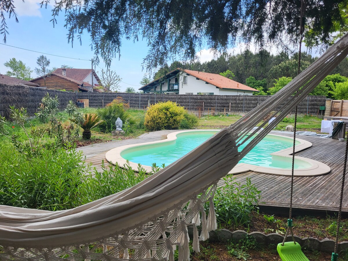 1,2 ac garden in the middle of a pine tree forest near the beach with a private swimming pool (4mx12m). This house is perfect to revitalize yourself. Next to a cycle track. 1 min from a lovely little village. 1h from bordeaux and Biarritz airport (esayjet and ryanair from london)