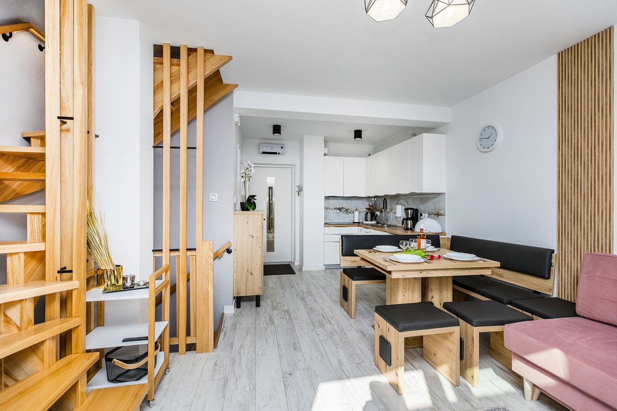 Apartament znajduje się nad pięknym jeziorem Czorsztyńskim u podnóża Pienin. Latem aktywni docenią prawie 40 km, najpiękniejszą w Polsce trasę rowerową biegnącą wokół jeziora, plaże czy możliwość wypożyczenia sprzętu wodnego. Z kolei zimą bliskość wielu kurortów narciarskich i aż 4 różnych pasm górskich. W obiekcie oddanym do użytku w 2021 znajduje się dobrze wyposażona siłownia, sauna, rowerownia, narciarnia i pralnia.