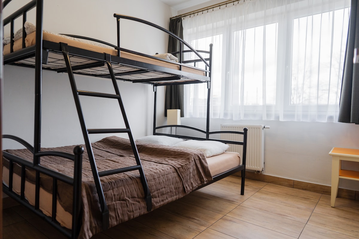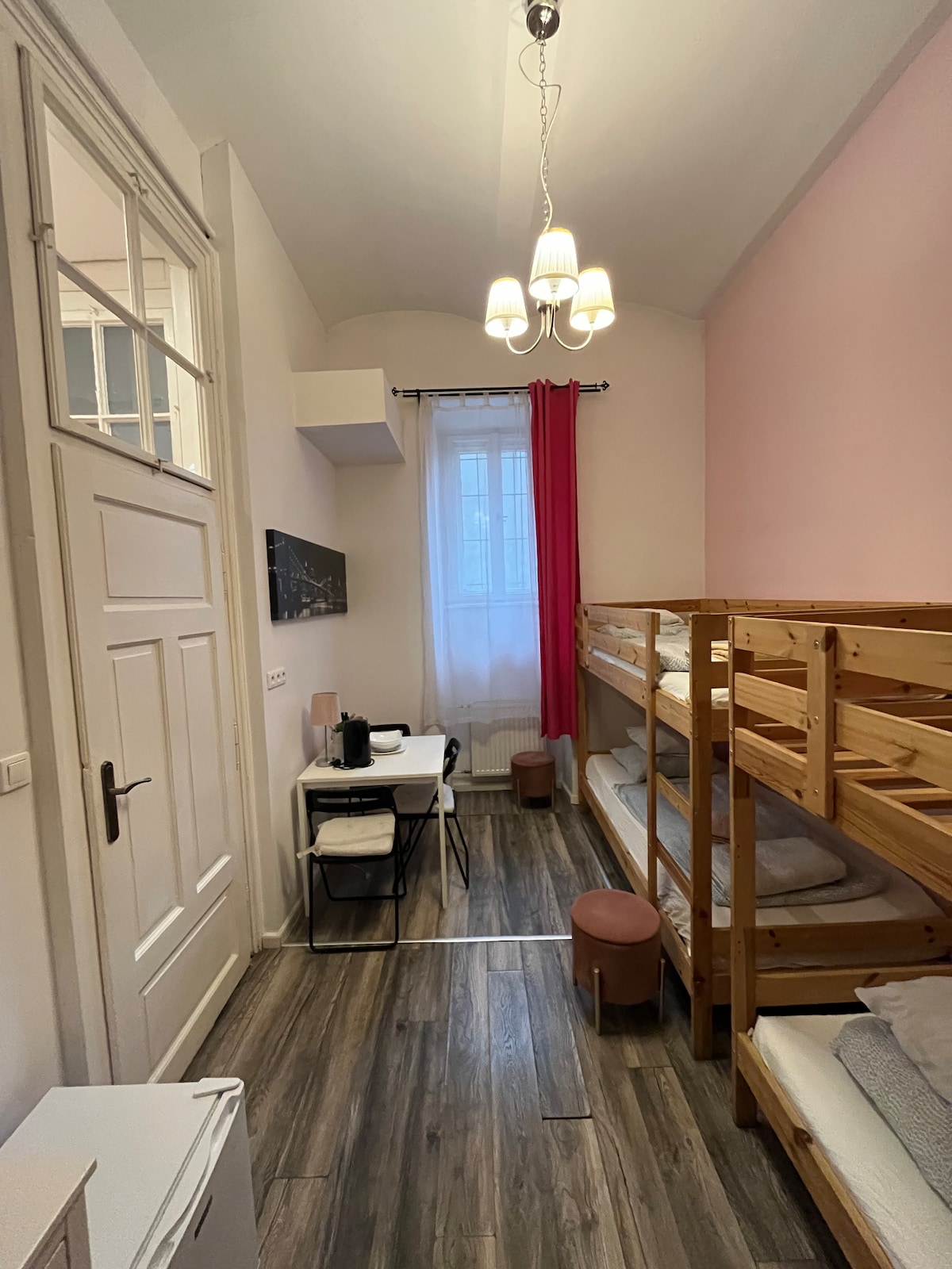 A six-bed room is a perfect place for a group of friends, or for open travelers, ready for new friends. Each of the beds has a comfortable mattress (90 × 200), while the whole room is designed in a thoughtful manner, guaranteeing comfort and privacy for the night guests. The bunk beds are equipped with stable ladders, and the upper mattresses are surrounded by railings, so even the youngest guests will be completely safe during sleep.