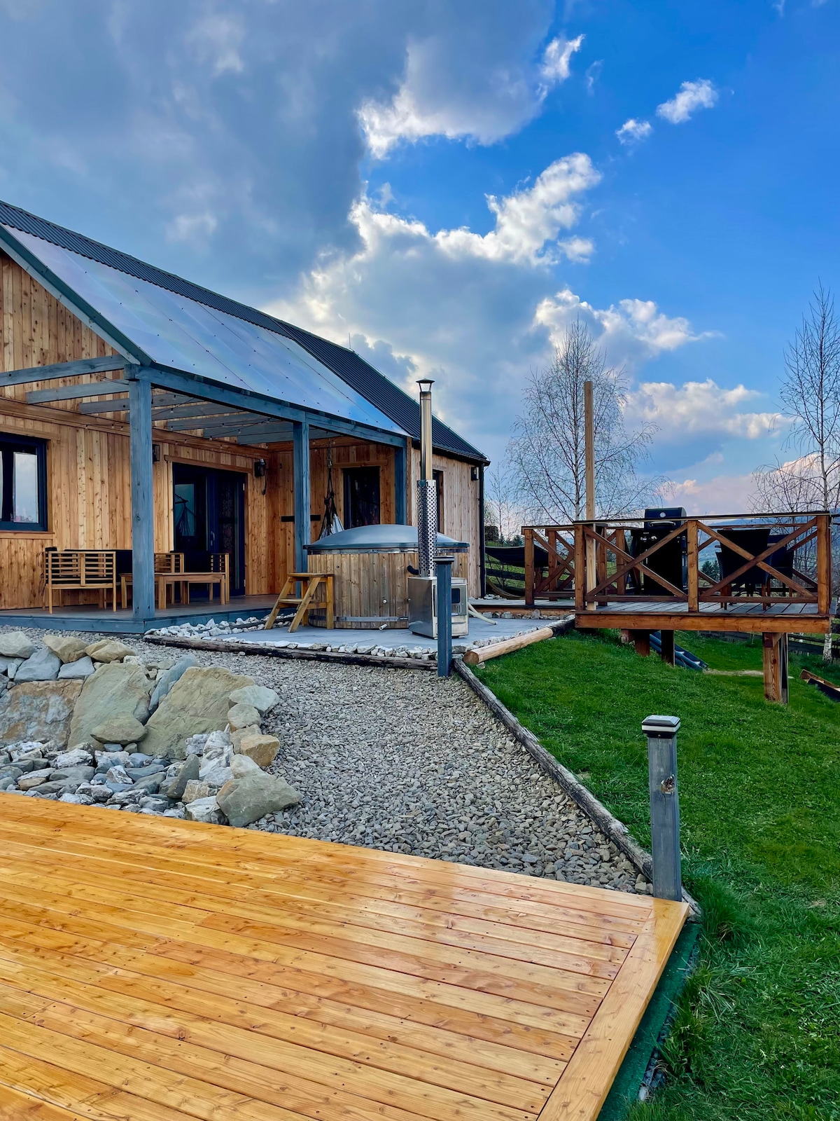 Witamy w wyjątkowym apartamencie w stylu Bauhaus. Apartament o powierzchni ponad 90m2 składa się z : -dużej sypialni z podwójnym łóżkiem oraz garderobą -małej sypialni z dwoma łóżkami pojedynczymi oraz wspaniałym ogromnym tarasem z widokiem na góry -małej sypialni z dwoma pojedynczymi łóżkami -nowoczesnej łazienki z wspaniałą wanną oraz pralko-suszarką -salonu z kominkiem połączonym z ogromnym nowoczesnym aneksem kuchennym. Na ogrodzie jest balia opalana drewnem pod piękną wiatą w cenie!
