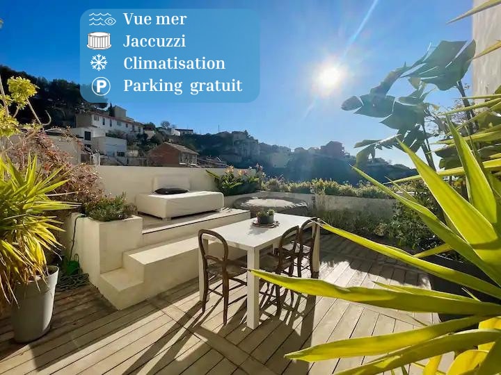→ Terrace with panoramic sea view → Renovated by a well-known architect → Modernly equipped : air conditioning in every room, fully-equipped kitchen → 4 bedrooms with queen-size beds (160 cm x 200 cm) and 4 bathrooms → Sauna and spa → Located 10 minutes from the calanques → 3 minutes from hiking trailheads → Direct access to the beach → No overlooking neighbors, very quiet → Bus just a short walk away → Private parking available next to the house