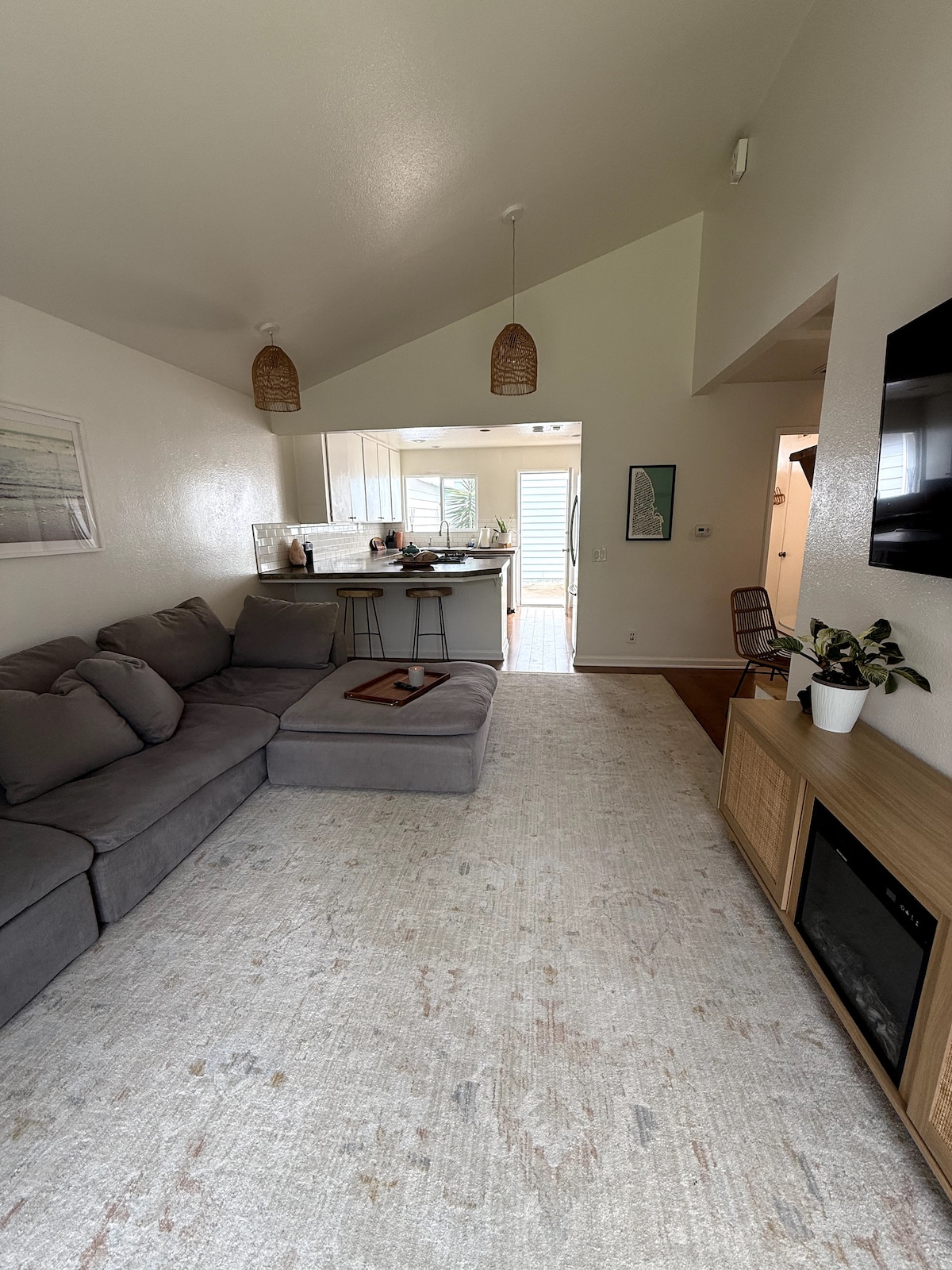 The Hideaway Leucadia is a 1 bd 1 ba detached space on our property with it's own private entrance and yard. Fully equipped for long term stays. It boasts 13' tall ceilings with exposed beams, artisanal finishes and boho socal decor. The couch is a pull out to sleep two additional guests. There is an outdoor firepit and market lights to enjoy summer nights in Southern California. Close to many famous surf spots; Beacons, Swamis, Ponto etc.