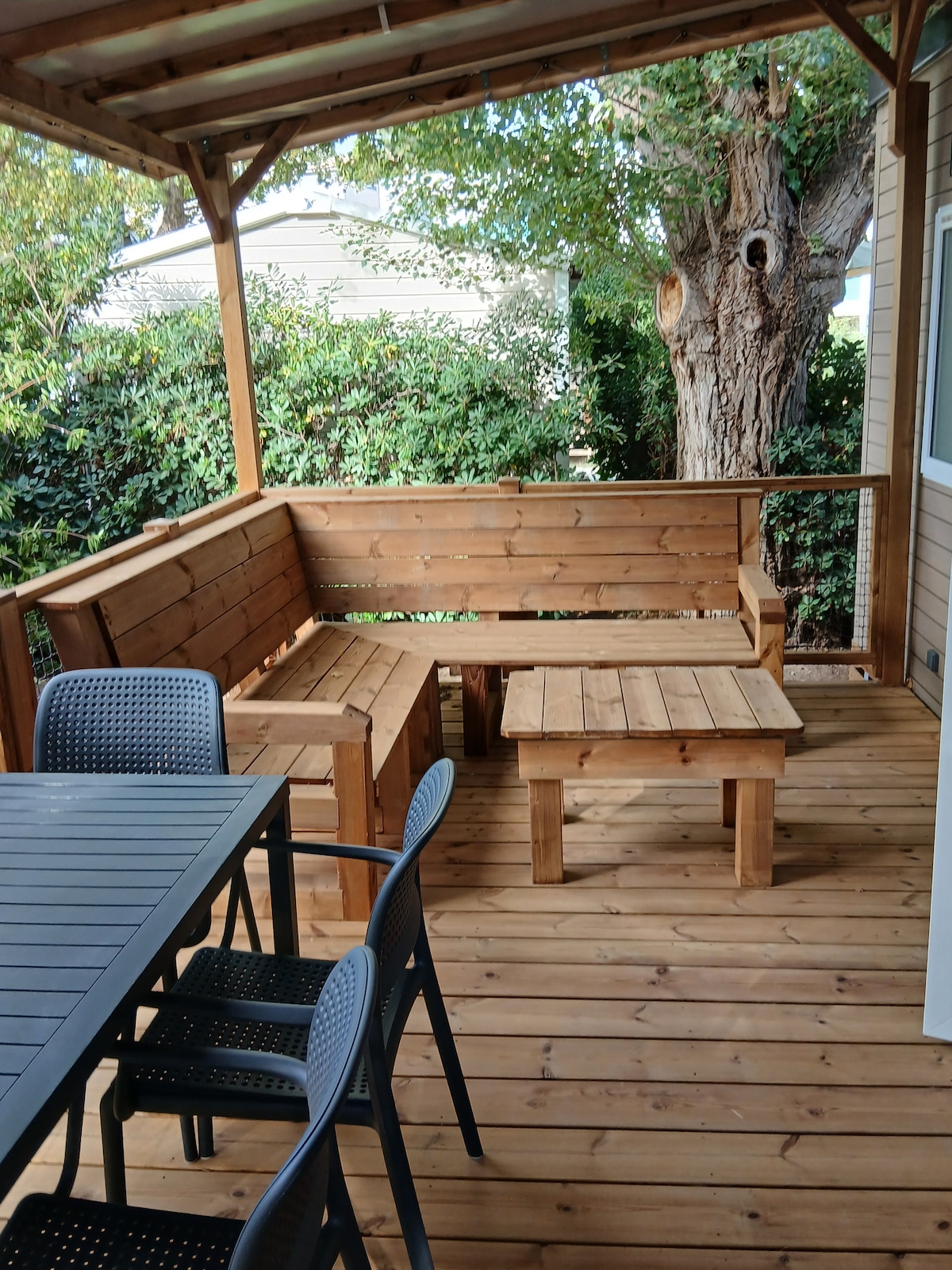 Mobil-home neuf pouvant accueillir jusqu'à 6 personnes, équipé d'un lave-vaisselle, d'une TV, climatisé et sur la terrasse vous retrouverez un salon de jardin avec table et chaise ainsi qu'un endroit cosy avec un canapé en bois avec coussin et une table pour de belles soirées en perspective.