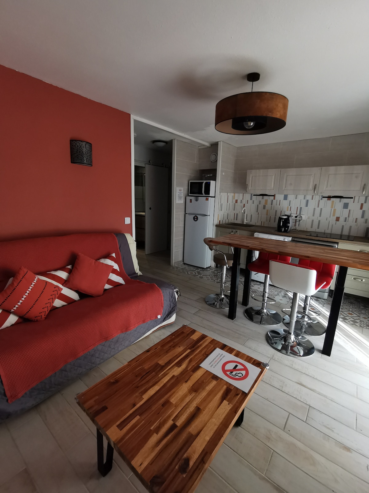 Bienvenue dans notre appartement au pied de la plage, idéal pour des vacances en famille ! Appartement climatisé offrant une vue mer depuis sa terrasse de 10m2. Il est composé d’une chambre séparée avec lit double et armoire. Le salon dispose d’un canapé lit, d’une TV avec accès WIFI. La cuisine est équipée d’un four, lave vaisselle, four micro-onde, une gamme SMEG. La terrasse comprend une table et 6 fauteuils ainsi qu’une plancha. Résidence sécurisée, calme et proche des commerces locaux.