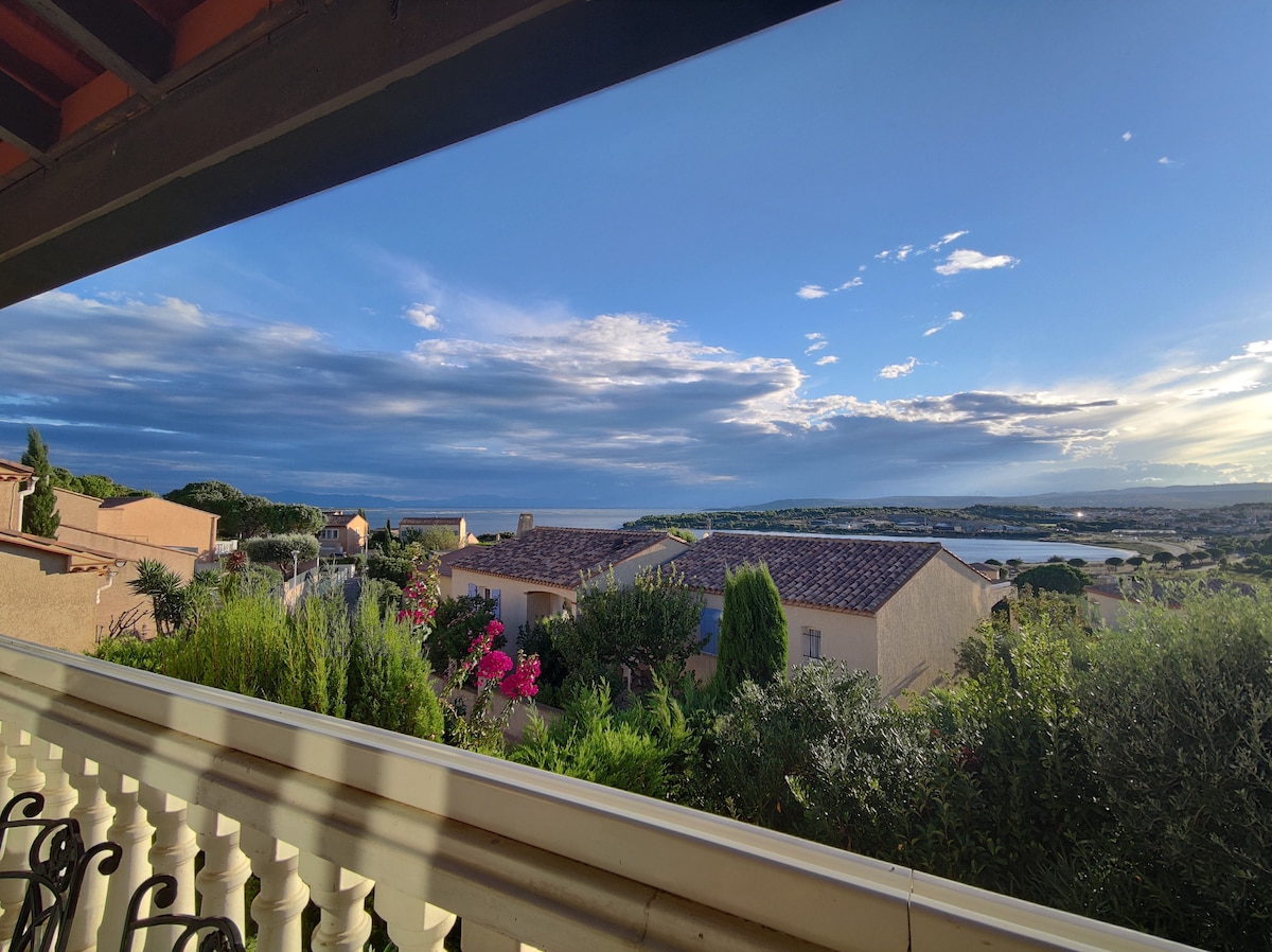 Live like kings and queens on top of the cliffs with a fantastic view of the ocean and the Pyrenees from a large sunny terrace. Light and bright 60 sq.mtrs 2 bedroom, 2 storey townhouse with A/C in Leucate-Plage with less than 10 minutes walk to the beach. 20 minutes walk to the cozy small village of Leucate. This is a quite laidback family place. Non smoking, and no pets. We have installed fibre for wifi. Easy outdoor parking, and private garage.