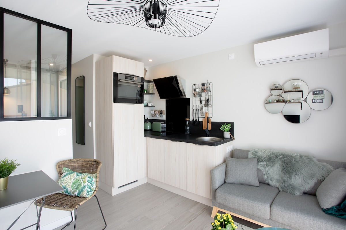 Profitez d'un logement élégant et central. Appartement dans résidence sécurisée, ascenseur, parking privé, local vélo, entrée autonome, accès direct sur le Port. Situé au pied des commerces, restaurants, bars, animations, marché, criée et à 500m de la plage. Tout confort, intégralement rénové au goût du jour, literie et mobilier neufs de qualité, draps et serviettes toilette fournis. Lit parapluie BB et chaise haute. Surface hab 25 m2. NB : Pas de climatisation. Ventilateurs dans chaque pièce.