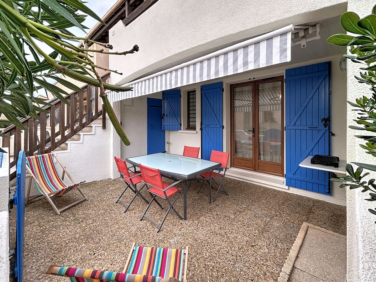 Appartement de plage cocooning en rez-de-jardin , à Leucate Plage, à 100 m du front de mer. Meublé avec soin aux couleurs de la Méditerranée, équipé pour des vacances confortables, un séjour détente ou activités en bord de mer. La pièce principale donne sur une belle terrasse abritée et un jardin clos ombragé avec point d'eau, barbecue. Cuisine ouverte toute équipée. Parking privé gratuit. Logement entier à disposition, linge de maison fourni gratuitement.