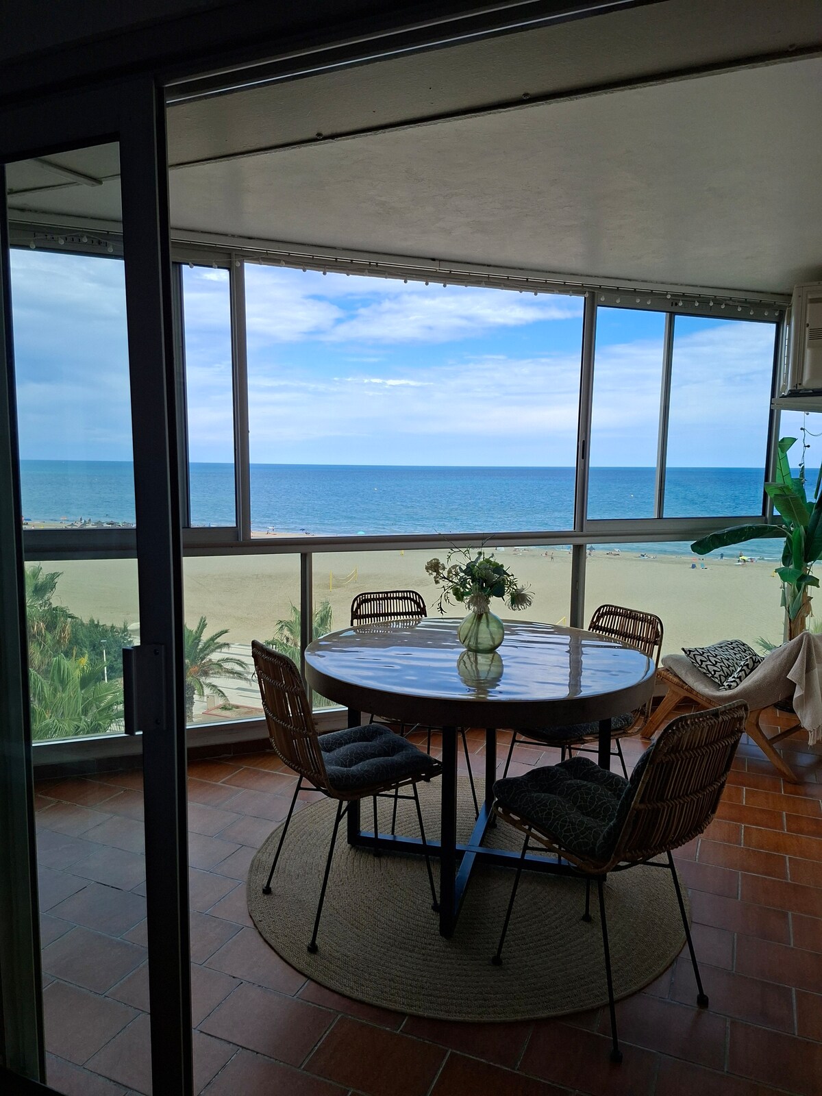 logement refait à neuf situé au 5 ème étage(38m2+10m2terrasse)- 2 ascenseurs- parking privé sur place (hauteur 1m90maxi)-tout confort -vue panoramique sur la mer depuis la terrasse couverte - Pas de vis à vis - Accès direct plage - 1 chambre lit double 140 - 1 coin nuit lit 140 - climatisation - cuisine équipée neuve plaque 4 feux à induction, four chaleur tournante - micro onde - lave vaisselle, lave linge séchant - TV connectée - Draps, serviettes de toilette fournis, wifi fibre-
