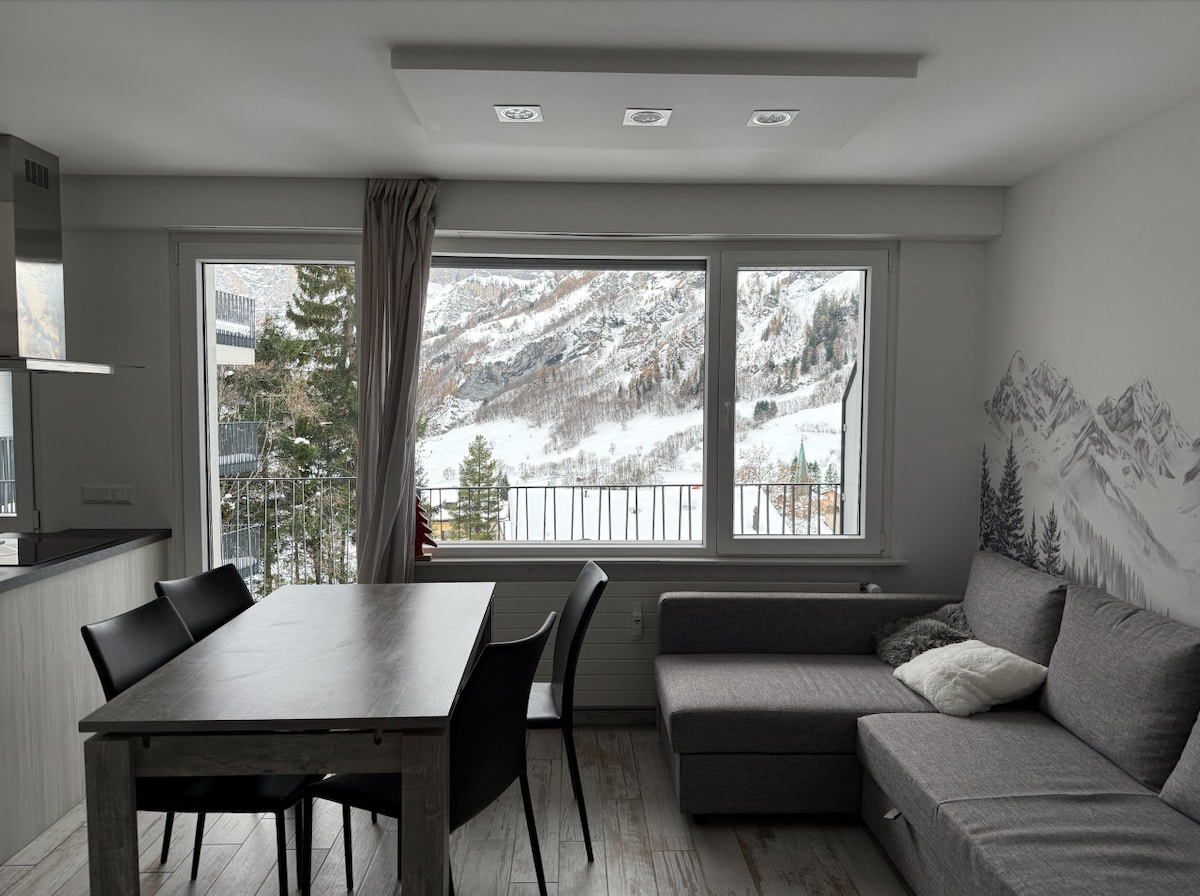 Our completely renovated apartment, on the top floor with a magnificent view, is located in the beautiful alpine village of Leukerbad. It is very suitable for 4-5 people. With the pull-out sofa, the apartment can also accommodate 7 people (but we find it a little cramped with 7). A parking lot is available free of charge. The distance to the bus stop is 1min, to the next bakery 5min and the ski valley run ends 6min walking distance (ski-in)