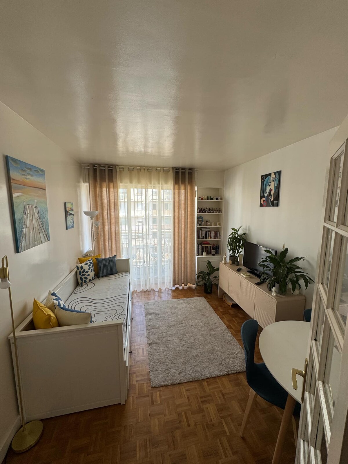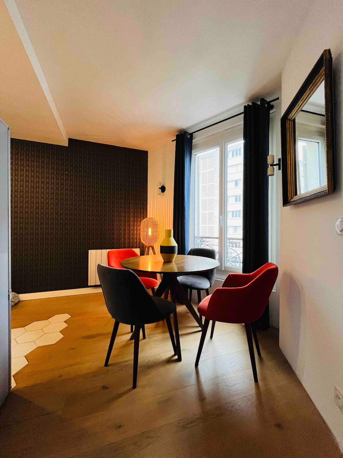 Top-floor haven with a large, sunlit balcony and an unobstructed Eiffel Tower view. Newly refurbished by a designer, it features an Italian shower, a comfy queen-size bed, and a quality sofa bed for groups of 3–4. Bright living/dining area, fast broadband and Netflix. Secure building in a vibrant neighborhood packed with cafés, restaurants, and shops. Metro station just 2 minutes’ walk. Perfect for couples, friends, or business stays.