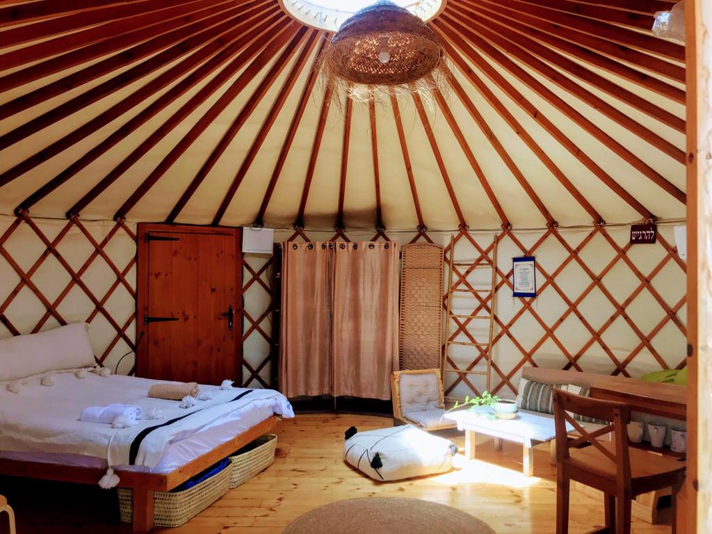 יורט - אוהל מונגולי בישוב הגלילי כורזים שצופה לכנרת, מקום שקט, מאפשר חוויה של מנוחה ורגיעה, קרוב לטבע. במקום בריכה עגולה מוקפת "דום" (Dome) לרשות האורחים, בעונה זו הבריכה מקורה והמים מחוממים - רגיעה לגוף ולנפש. שפע של מסלולים, נחלים ומעיינות במרחק נסיעה קצר שאשמח להמליץ.