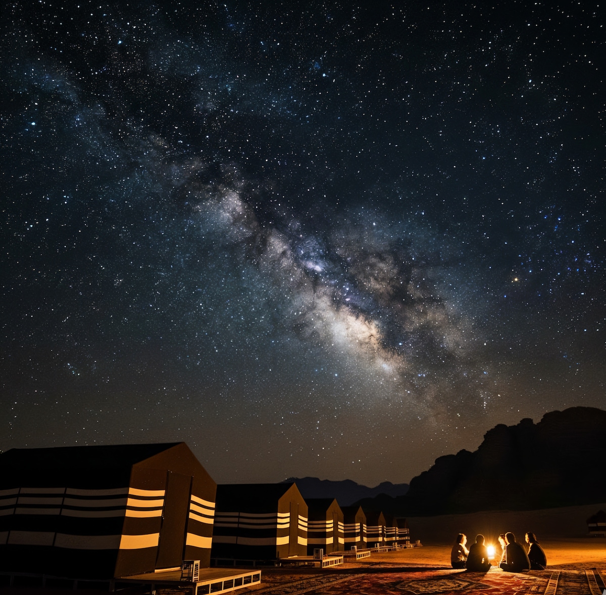 A camp in the middle of the desert. It is characterized by its tranquility. It is characterized by its space tent. It is characterized by its beautiful view and its view. At night, you can see the stars and the moon very clearly.