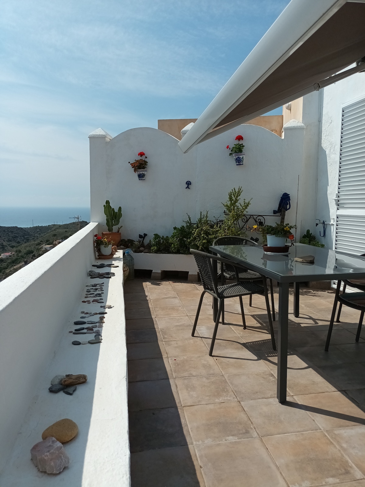 Enjoy your stay in this pretty, centrally located village house in Bedar village, only a short walk to all amenities, tapas bars, art centre, bakery etc etc. The bright , quirky house is all on one level with steps to an outside terrace with fabulous sea views. There are two double bedrooms , one with a Juliet balcony. The kitchen is modern & newly fitted and the living room also has a dining area. Also parking is not a problem with a parking space for this house only!. A fabulous property.