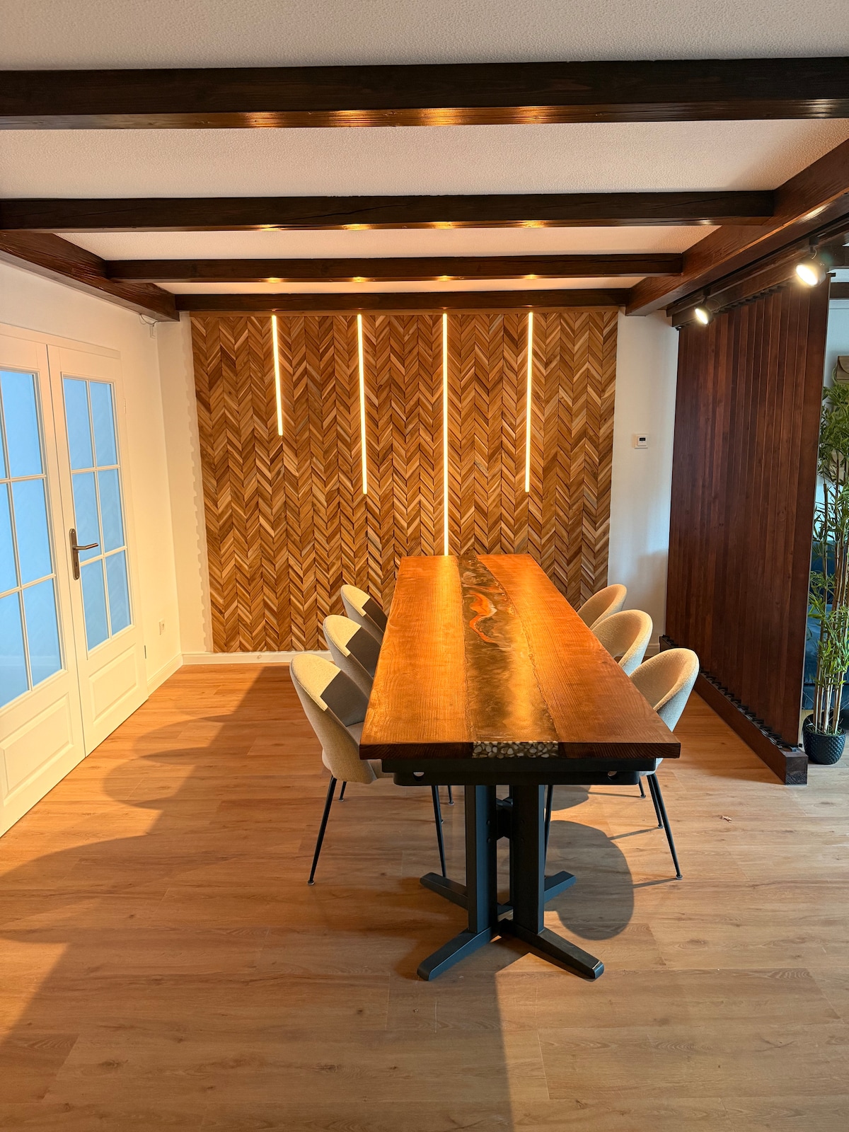 🏡 Moderne, große Wohnung (ca. 120 m²), großzügig geschnitten und mit viel Liebe zum Detail eingerichtet – ideal für Familien, Freunde oder kleine Gruppen. Die Räume sind hell, hochwertig ausgestattet und vermitteln eine gemütliche, einladende Atmosphäre mit stimmungsvoller Ambientbeleuchtung. Der offene Wohn- und Essbereich bietet viel Platz zum Zusammensein sowie Zugang zur ebenerdigen Terrasse mit Teich und überdachter Sitzlounge.