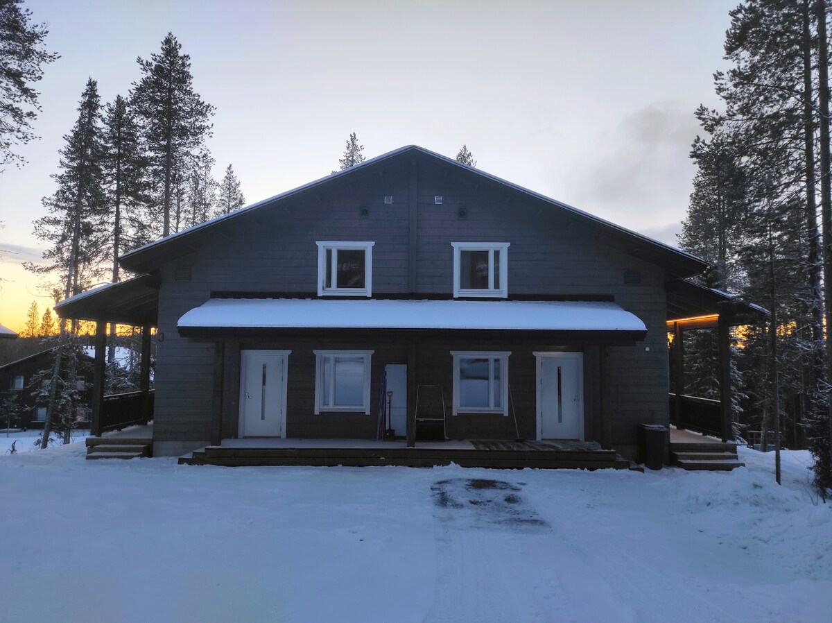 Siisti ja kotoisa mökki(paritalo) 2,5 km päässä Levin keskustasta. Saat nauttia luonnon rauhasta, hiihtämään pääset lähes pihasta ja rinteisiinkin on lyhyt matka. Leviltä löydät kaikki palvelut ja aktiviteetteja löytyy sekä talvella että kesällä. A clean and cozy cottage (semi-detached house) 2.5 km from the center of Levi. You can enjoy the peace of nature, you can go skiing almost from the yard and the slopes are a short distance away.