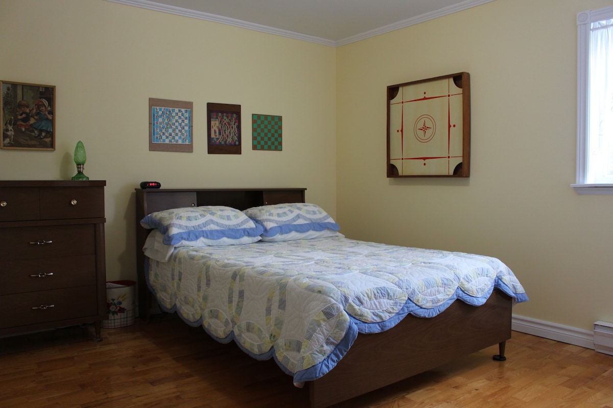 Comme une suite a l'hôtel, grande chambre privée avec petit salon et salle de bain complète. Insonorisée et climatisée, vous dormirez comme des bébés. Le cable et les canaux spéciaux, ainsi que le Wifi haute vitesse vous sont offerts. Également offert, un petit déjeuner pour commencer la journée. Maison ou il fait bon vivre, entourée de la nature boréale. Nous sommes a quelques minutes des grands artères. Grand terrain aménager en permaculture.