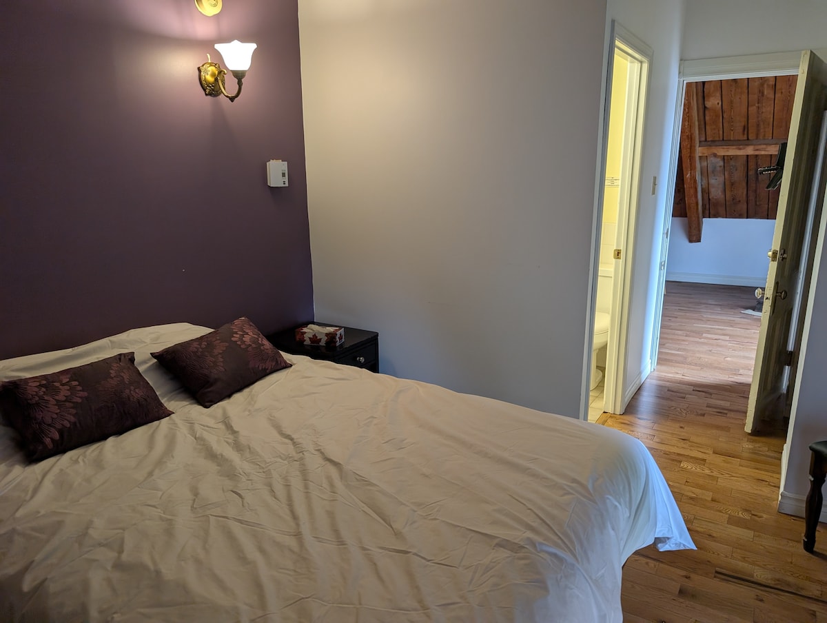 Nous vous invitons à séjourner dans une chambre douillette aux allures champêtres. Vous y trouverez un grand garde-robe, une télévision intelligente, un meuble console, deux tables de chevet et bien plus! Chaque chambre possède sa salle de bain attenante complète et privée. Des espaces communs confortables sont aussi à votre disposition; 2 cuisines, grande salle à manger, salon, terrasses, spa, etc.