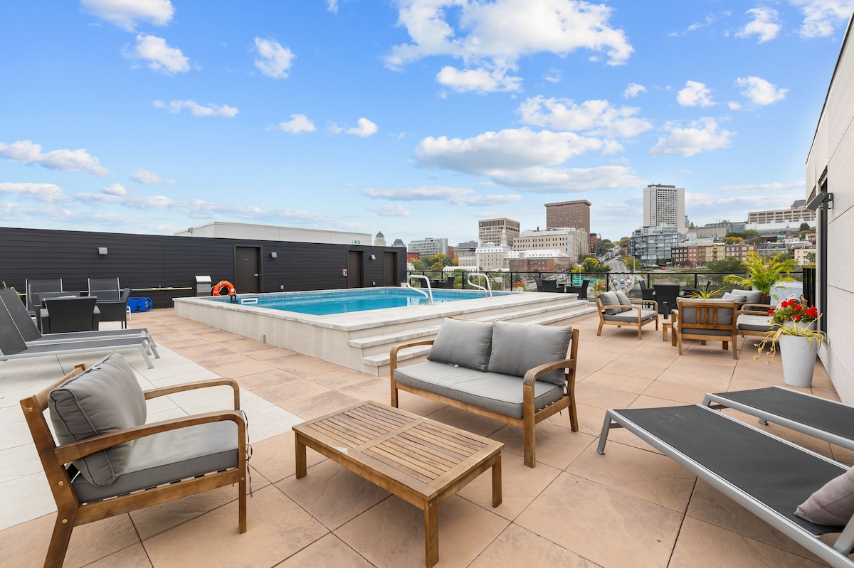 Come and enjoy an unforgettable stay in the heart of the Saint-Roch district in Quebec City. This modern and luxurious condo will charm you as much by its common spaces as by its interior design. ✧️ Indoor Parking included ✧️ Roof terrace with pool, dining area & outdoor fireplace ✧️ BBQ available year-round on the rooftop. ✧️ Fitness room ✧️ Bright and pleasant apartment ✧️ Fast wifi and work space ✧️ Just a 15 minute walk to Old Quebec