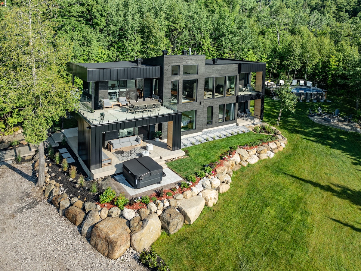 Luxurious Scandinavian-inspired chalet designed by CARTA architect. This mountainside villa offers spectacular views of the majestic St. Lawrence River. A spacious top-floor terrace offers breathtaking views. Wood-burning fireplaces, a spa, an indoor sauna, a lounge area, and workspaces provide a relaxing setting. Everything has been designed to make this home a haven of peace where gatherings with friends, colleagues, or family will be memorable.