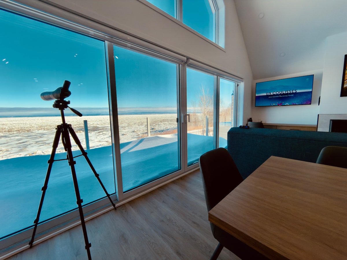 La Chaumière.. le fleuve, confort et nature •. Havre de paix en pleine nature • Vue imprenable sur le majestueux fleuve •. Grande terrasse privée •. Wifi haute vitesse, smart TV • Appart. 1200 pi2, 3 chambres, rénové, tout équipé • Destination 4 saisons à 5 km de St-Jean-Port-Joli • Foyer au bois pour des soirées douillettes •. À 2 mins de l'excellente Queue de Homard restaurant familial