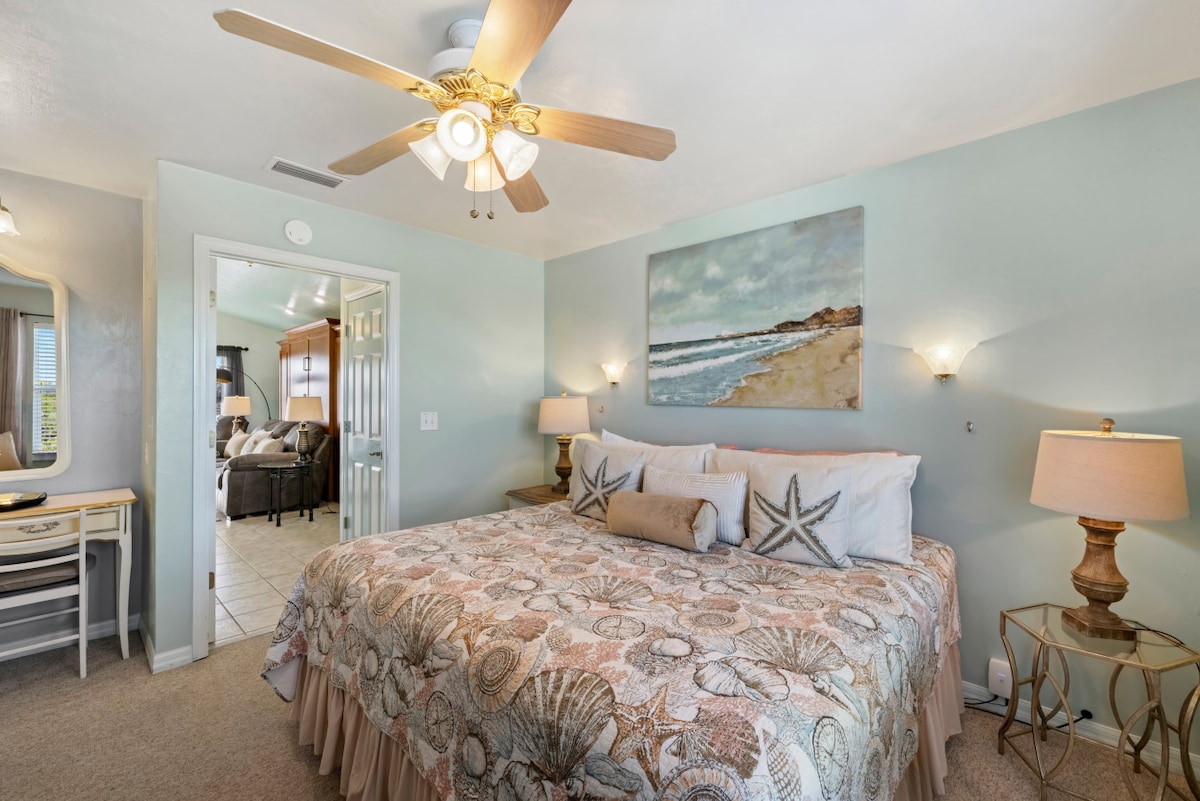Stunning views of the Gulf of Mexico from your private patio and from within this ground floor unit. This newly renovated unit is packed with smart spaces and colorful accent pieces. The fully equipped kitchen with a custom made butcher block island is sure to please any chef. The memory foam California king bed will assure you a restful dreamy sleep. You are one block away from Dock Street's restaurants, shops, and music venues. Come to Cedar Key and explore the beautiful island life!