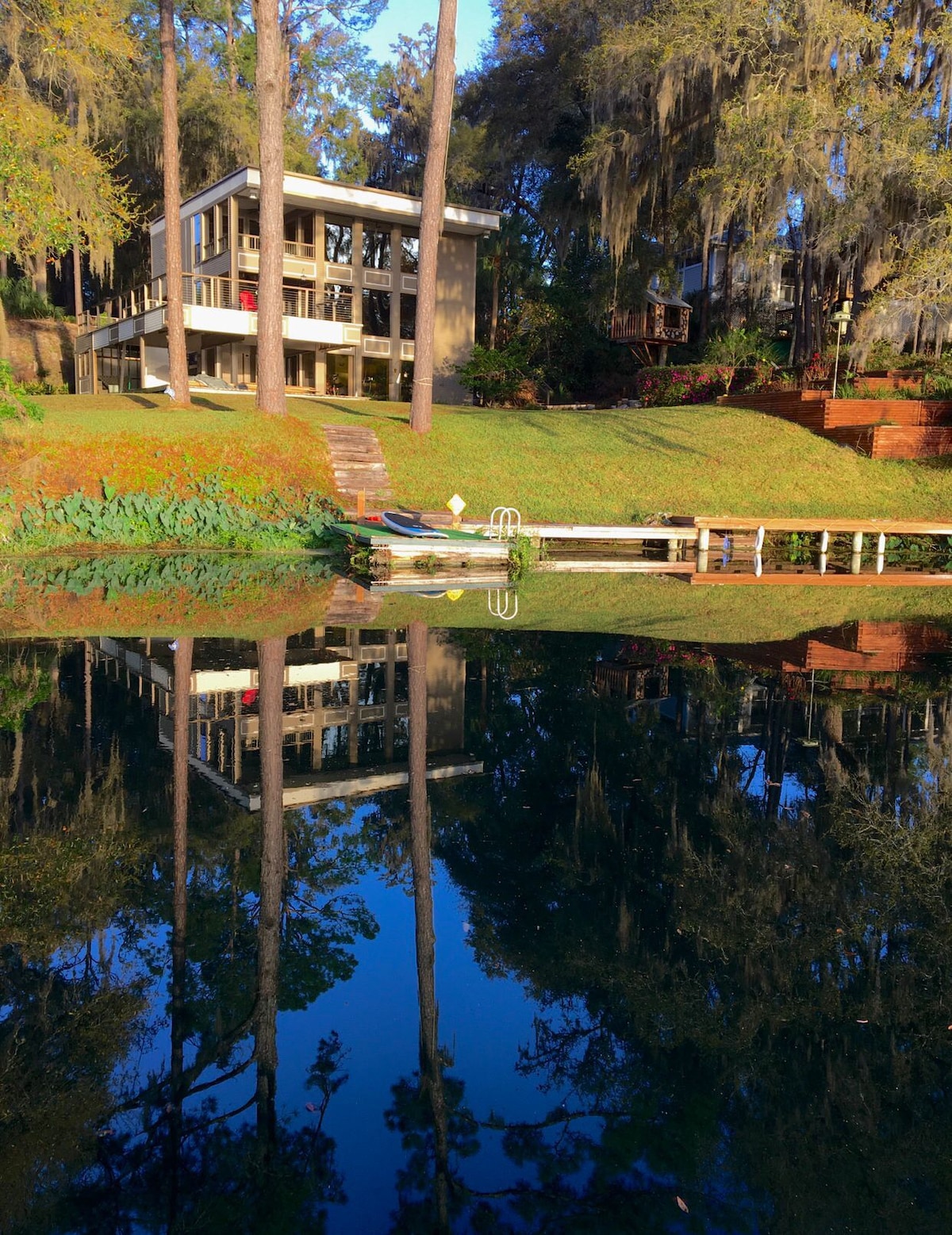 ☀Stunning sunsets on Lake Rousseau ☀Enjoy the glistening lake, natures sounds, and stunning views from your screened-in porch, dock or fire-pit ☀Activities: OK! Perhaps some corn hole or football on the manicured lawn if you are not too mesmerized by the sun glistening off of the water, the birds landing on the lake, or the many 300 y.o. Live Oak trees with Spanish moss that provide shade and filtered sunlight ☀Grill and then end the day with Sunset, peaceful sounds and S'mores on your bonfire