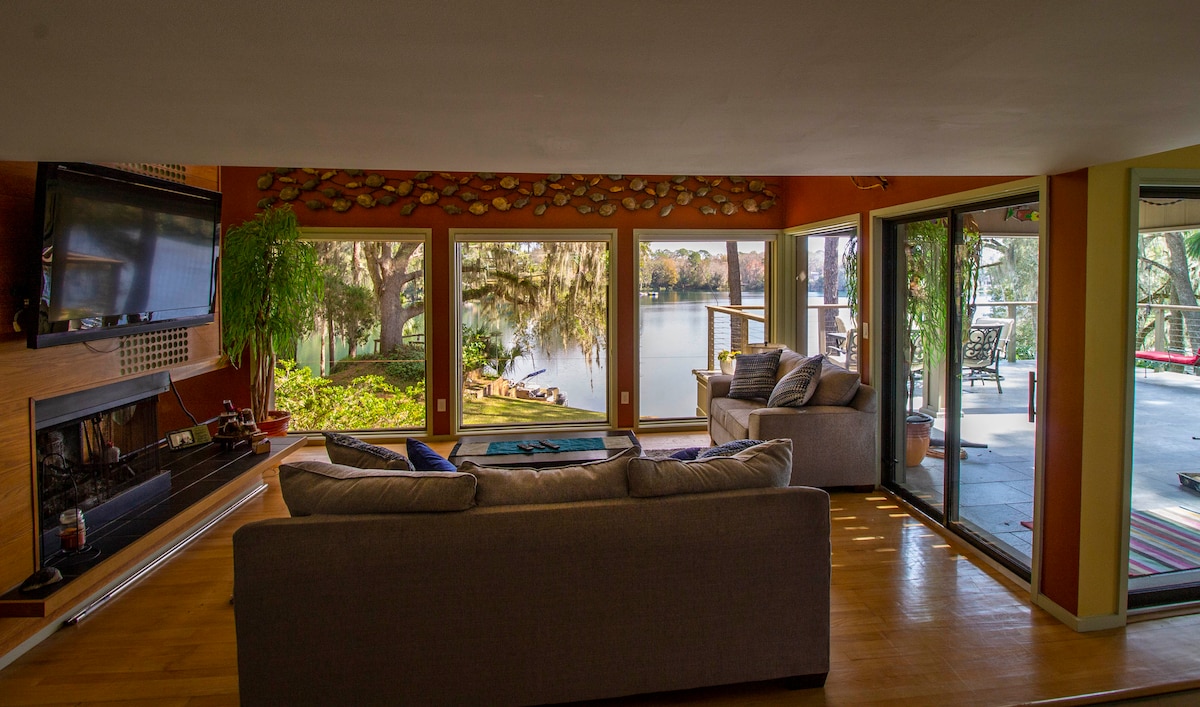 ☀Stunning sunsets on Lake Rousseau ☀Enjoy the glistening lake, natures sounds, and stunning views from your screened-in porch, dock or fire-pit ☀Activities: OK! Perhaps some corn hole or football on the manicured lawn if you are not too mesmerized by the sun glistening off of the water, the birds landing on the lake, or the many 300 y.o. Live Oak trees with Spanish moss that provide shade and filtered sunlight ☀Grill and then end the day with Sunset, peaceful sounds and S'mores on your bonfire