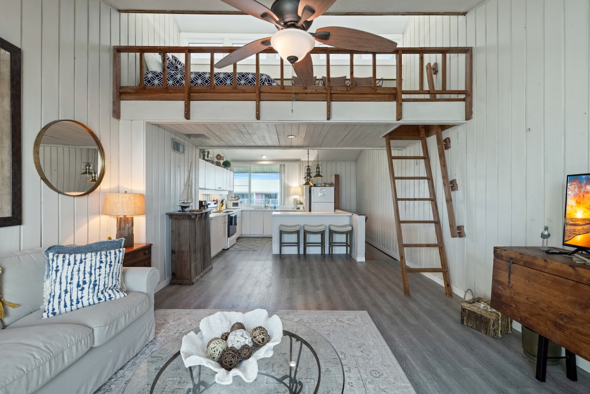 Welcome to our pet-friendly unit! Gorgeously designed for up to 4 guests and your furry friends. Enjoy the comfortable full-size loft bed and a convenient queen-size sofa bed. The spacious bathroom features a standing shower, full toiletries and stunning butcher-block counters. A well-equipped kitchenette includes a mini-fridge, microwave, and dishes. Relax in the inviting seating area with a couch, chair, and 36-inch Roku TV. Pls clean up after your pet and don’t use our towels! Please !