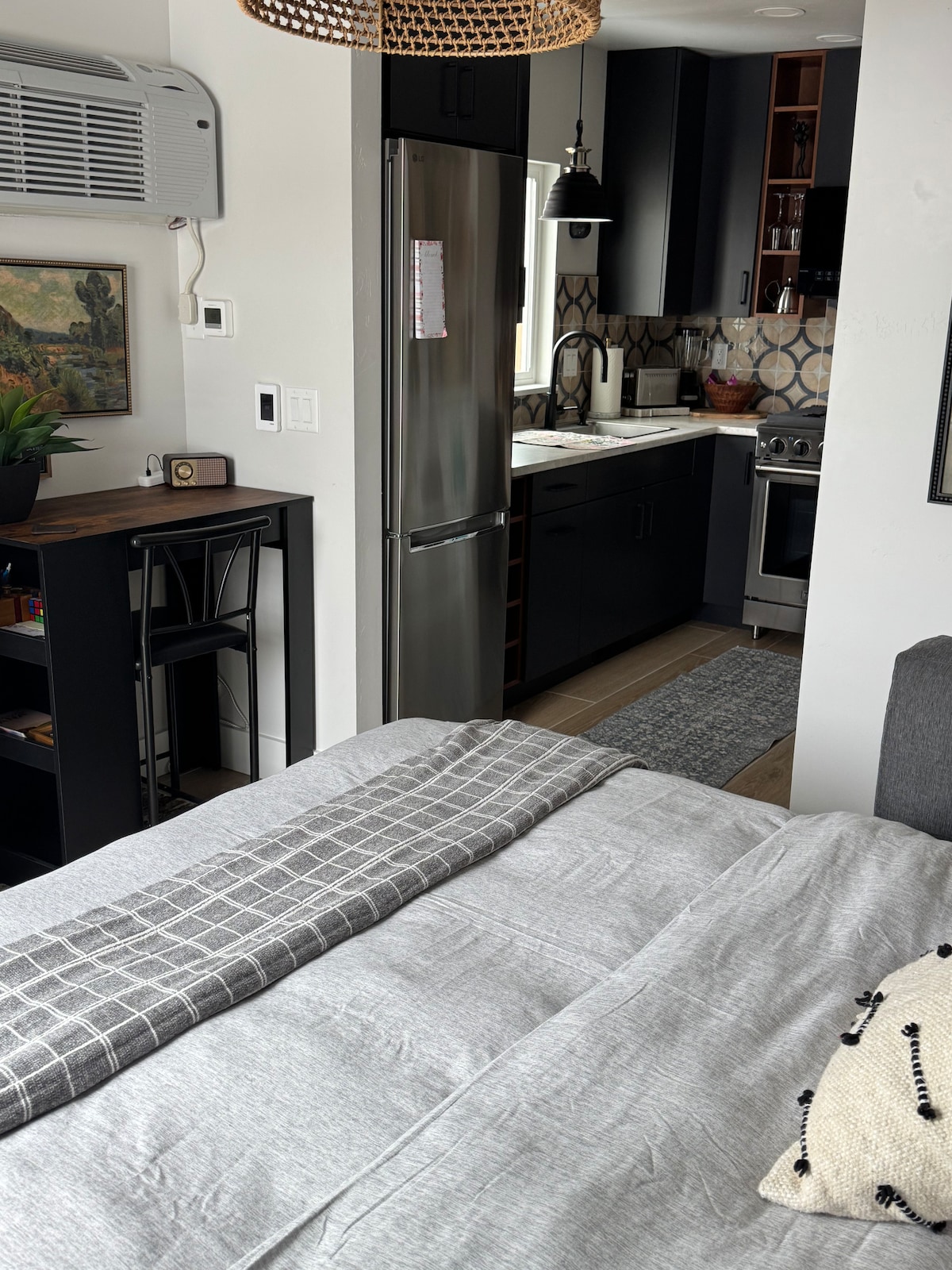 This unique place has a style all its own. Well designed studio with a queen size murphy bed. About the space: The space is equipped with both in floor heat and AC to keep you comfortable, it is perfect for a relaxing getaway. This studio has a modern full-service kitchen; the bathroom is modern and has a chic design. There is an in unit washer/dryer combo along with a dedicated workstation to catch up when you are away. There is also a 2 bed unit that can be rented together with the studio.