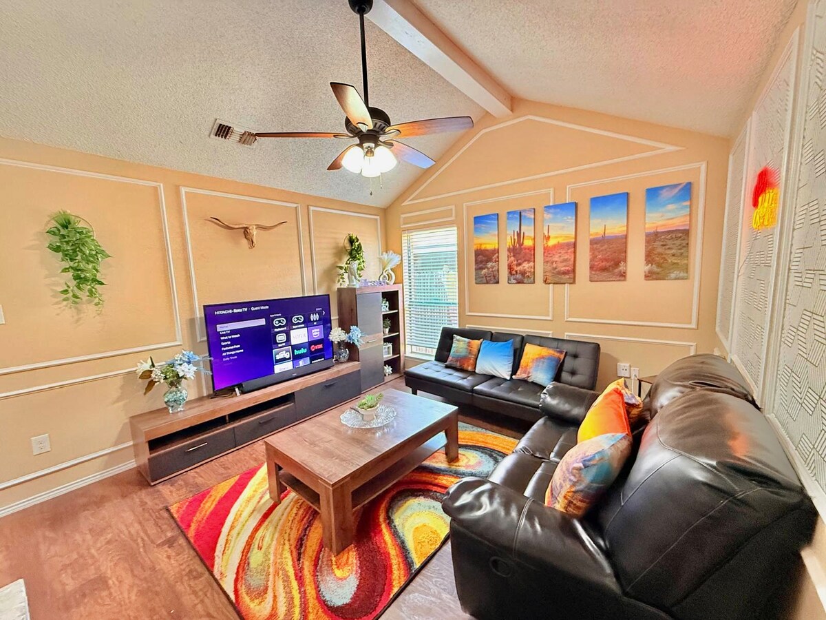 Dallas Cowboys Fans! Skip $120+ stadium parking! Our driveway fits 3 vehicles and located within a cul de sac with free street parking (can accommodate your big trucks, trailers, even RVs). AT&T Stadium is just 2.8 miles away. Uber cheaply to the stadium with your group for $15 or less! Got strong legs? You can enjoy a scenic 60 mins stroll instead. Perfect game-day spot! Spacious 3BR, 2BA townhome in a quiet neighborhood, perfectly located within Arlington entertainment district.
