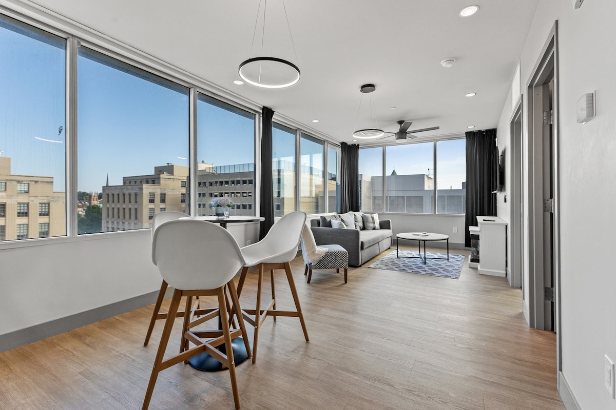 The Top Shelf is a space carefully crafted with amenities aplenty! Perched on top of the 90-year-old Pepper Bourbon Distillery, this condo is for the Lexington visitor who likes to be in the middle of the action. Soaring views, three balconies, and all the amenities to make your Bluegrass visit one of a kind. The Top Shelf is perfect for a discerning couple, an adventuring family, or for a group of fun-seekers. Large parties are not allowed. Maximum guests, per LFUCG code restrictions =10